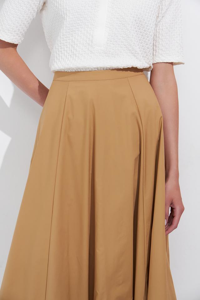 Юбка имеет А-силуэт и длину миди, что делает ее универсальной для разных случаев. Множество аккуратных складок придают ей объем и изысканность. Модель выполнена из 100% хлопка, что обеспечивает комфорт и воздухопроницаемость.