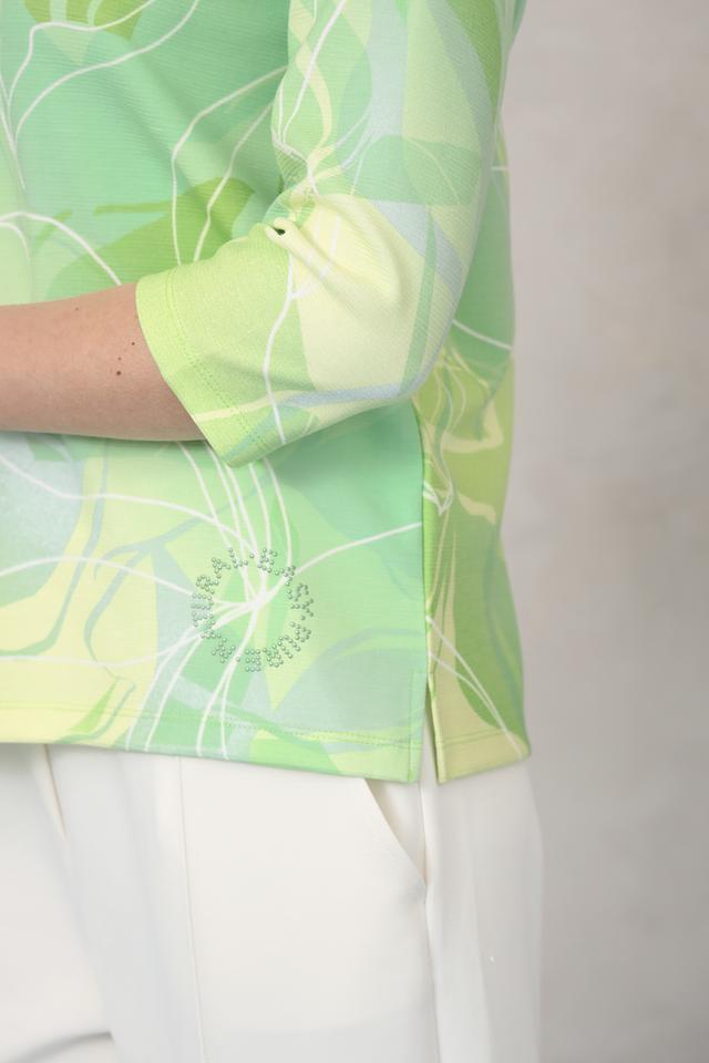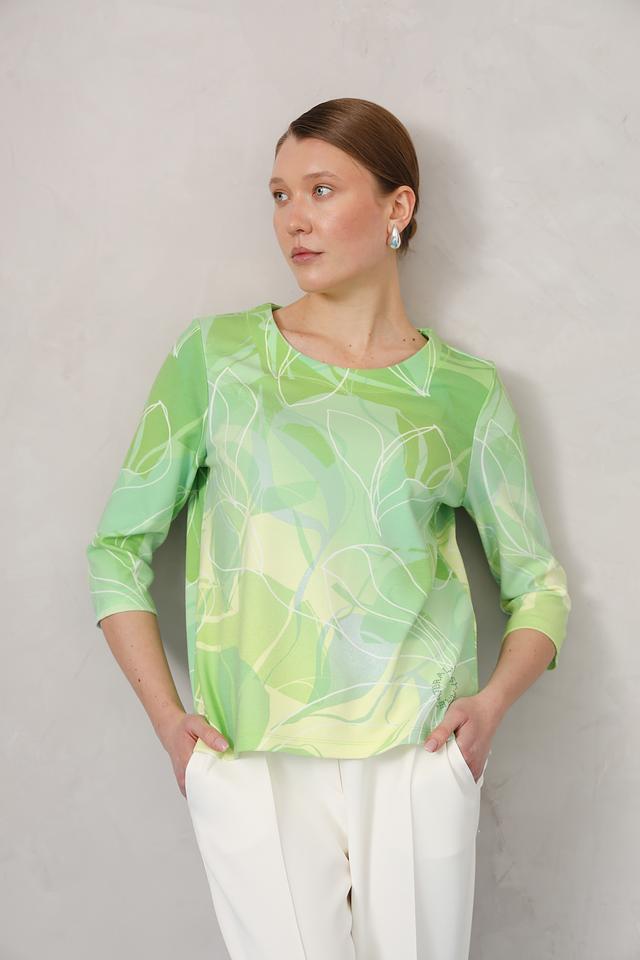 Пуловер имеет свободный крой и короткие рукава, что делает его идеальным для теплой погоды. Его основной цвет – лайм, украшенный ярким и необычным принтом в виде листьев. Такой рисунок добавляет образу свежести и оригинальности.
