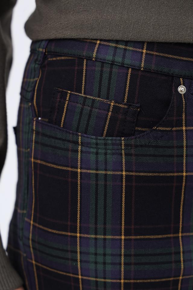 Брюки выполнены из высококачественного хлопка (93%) с добавлением эластана (7%), что обеспечивает комфорт при носке, хорошую посадку и сохранение формы. Клетка выполнена в сочетании зеленого, черного и бежевого цветов, создавая эффектный и запоминающийся дизайн.