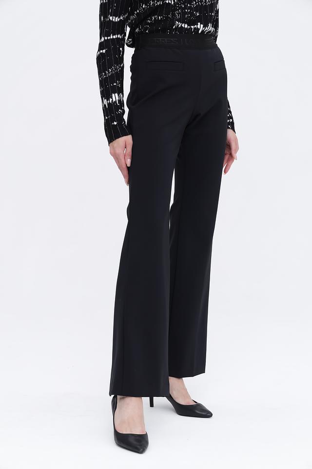 Брюки имеют высокую посадку, что визуально удлиняет ноги и подчеркивает талию. Крой клёш придает образу женственность и элегантность. Ткань состоит из 88% полиамида и 12% эластана, что обеспечивает комфорт в носке, хорошую посадку и устойчивость к сминанию.