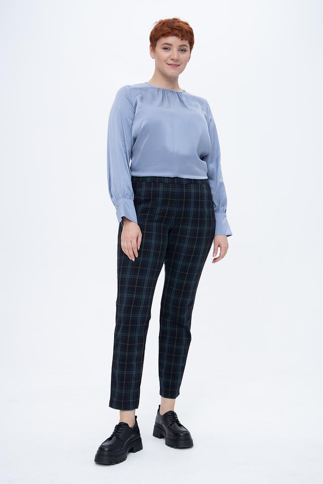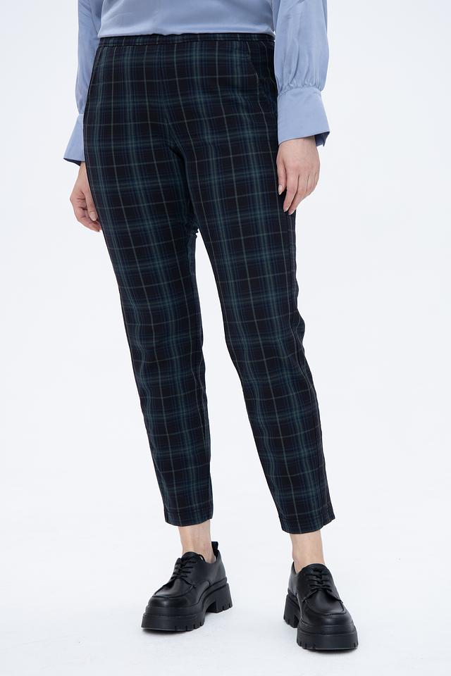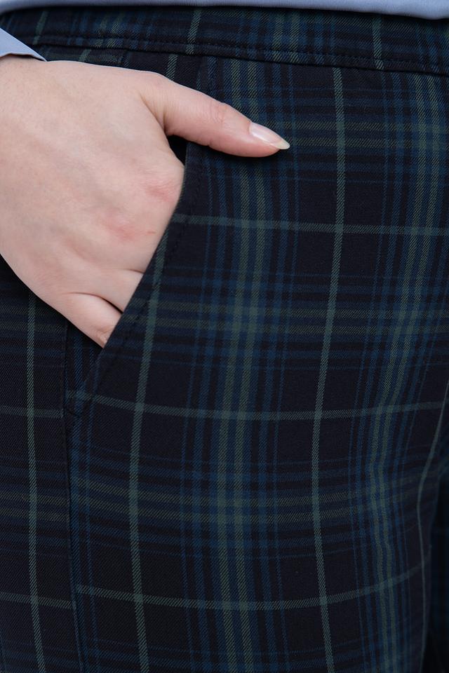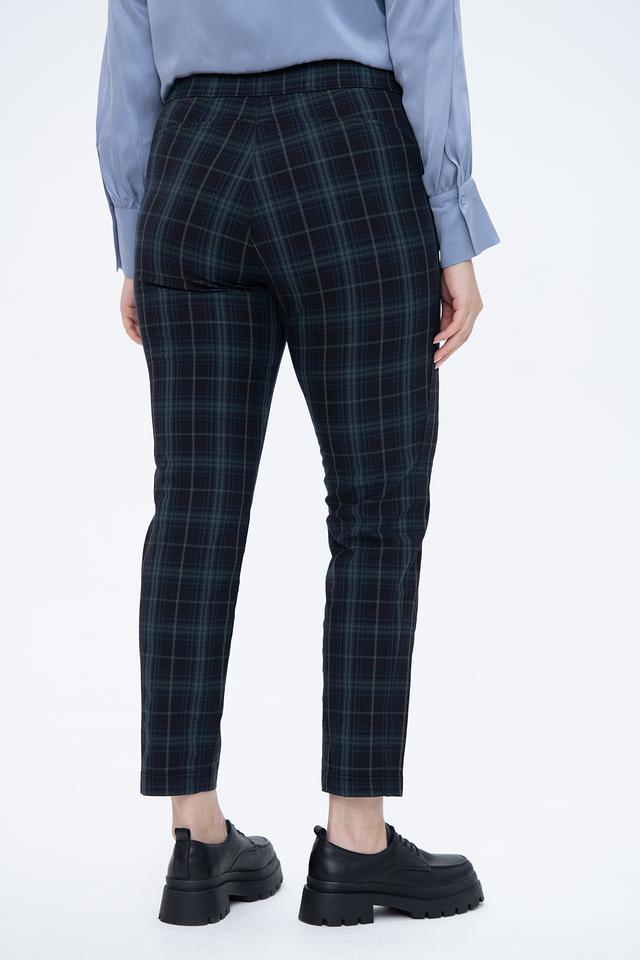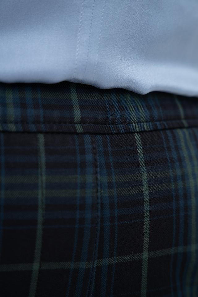 Брюки выполнены из высококачественного хлопка (93%) с добавлением эластана (7%), что обеспечивает приятные тактильные ощущения, хорошую посадку по фигуре и свободу движений. Клетка выполнена в сочетании тёмно-зелёного, синего и чёрного цветов, создавая элегантный и универсальный образ.