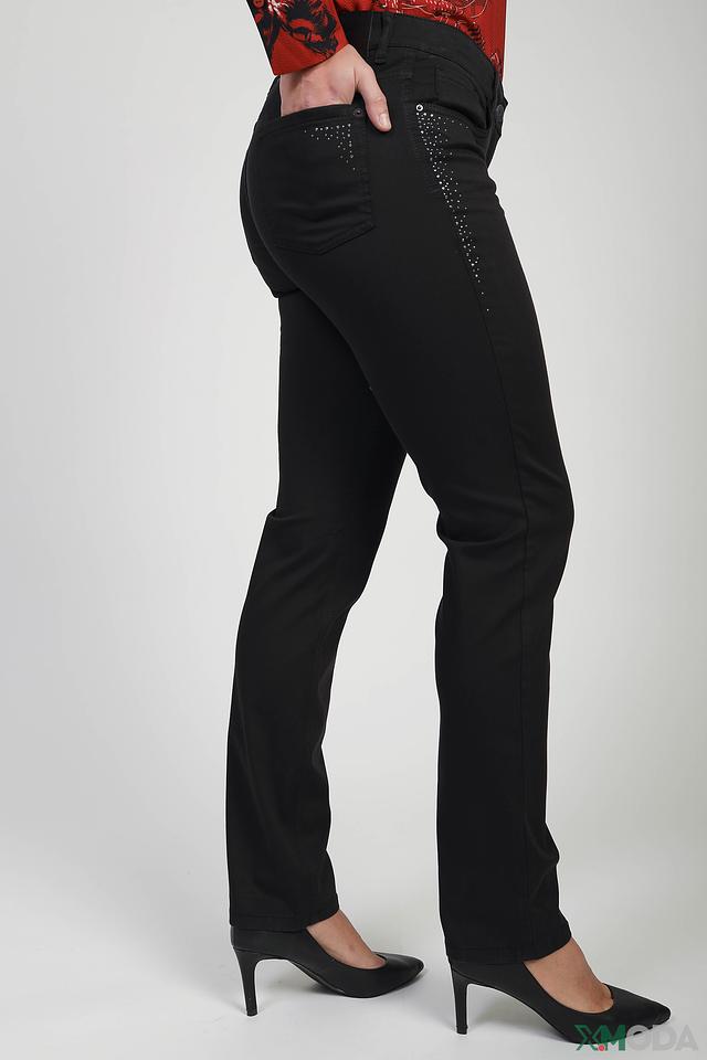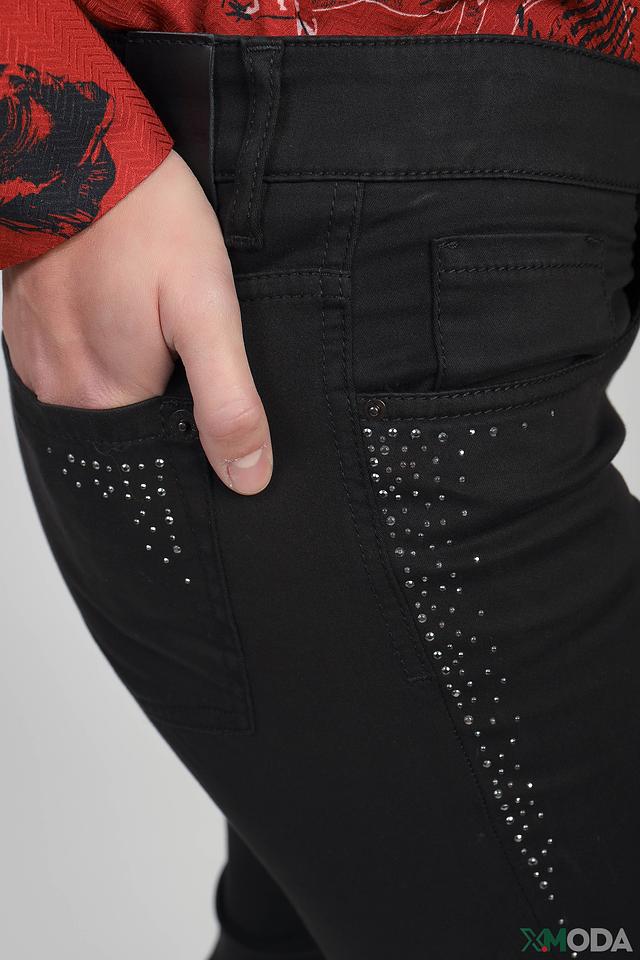 Джинсы имеют прямой крой, который подчеркивает фигуру, не сковывая движений. Отличительной особенностью является декоративная отделка задних карманов стразами, придающая образу изысканность и индивидуальность.