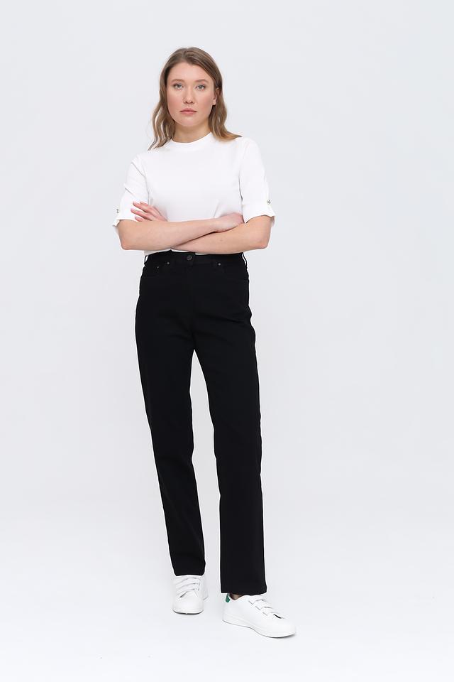 Джинсы имеют прямой крой, обеспечивающий комфортную посадку по фигуре и свободу движений. Высокая посадка визуально удлиняет ноги и подчеркивает талию. Ткань состоит из хлопка, полиэстера и эластана, что обеспечивает удобство в носке, износостойкость и небольшую эластичность.