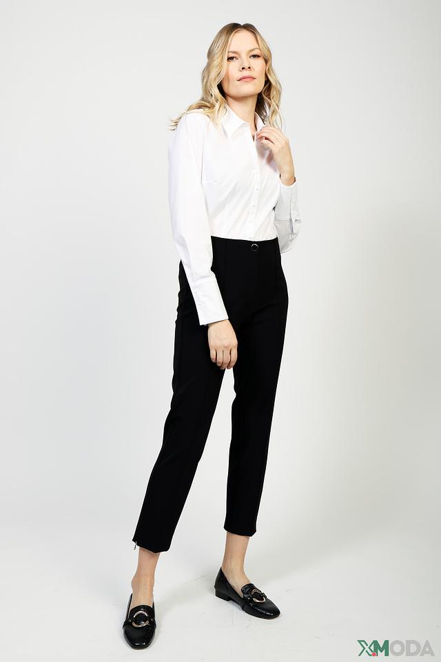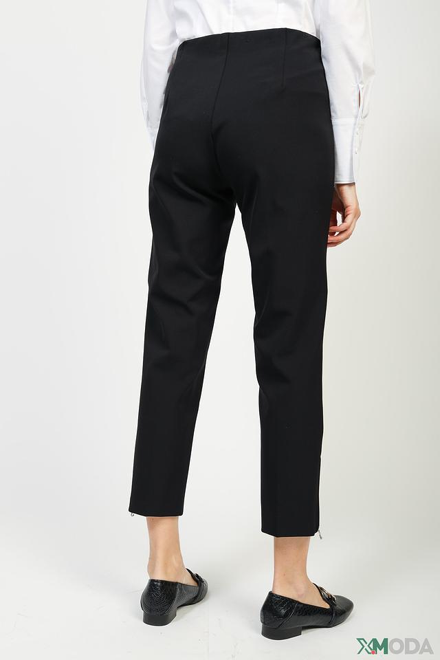 Брюки имеют прямой крой и высокую посадку, что обеспечивает комфортную посадку и визуально удлиняет ноги. Застежка на молнию и пуговицу, а также небольшие разрезы внизу штанин добавляют брюкам изысканности.