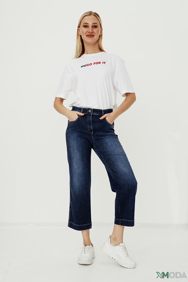 Джинсы имеют укороченный крой и высокую посадку, что визуально удлиняет ноги и подчеркивает талию. Прямой крой обеспечивает комфортную посадку и свободу движений. Ткань состоит из хлопка, вискозы и небольшого процента эластана, что обеспечивает мягкость, приятные тактильные ощущения и небольшую эластичность.