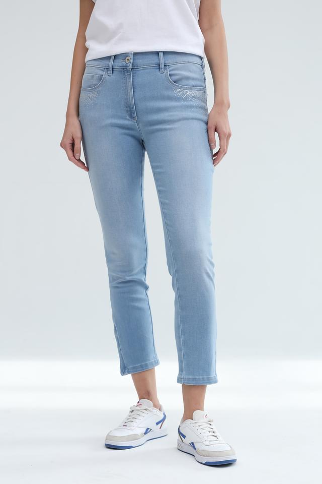Светло-голубые джинсы Zerres с утончённым декором из кристаллов — идеальный выбор для создания стильного и комфортного образа. Модель выполнена из качественного хлопка с добавлением полиэстера, лиоцелла и эластана, обеспечивающих удобную посадку и долговечность. Состав: хлопок 71%, полиэстер 16%, лиоцел 11%, эластан 2%