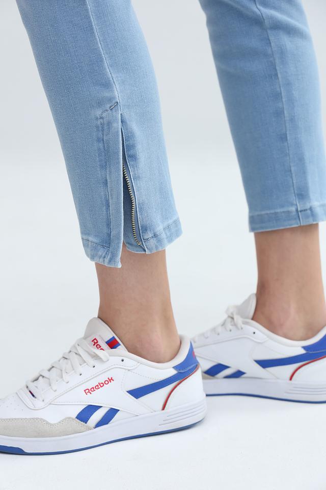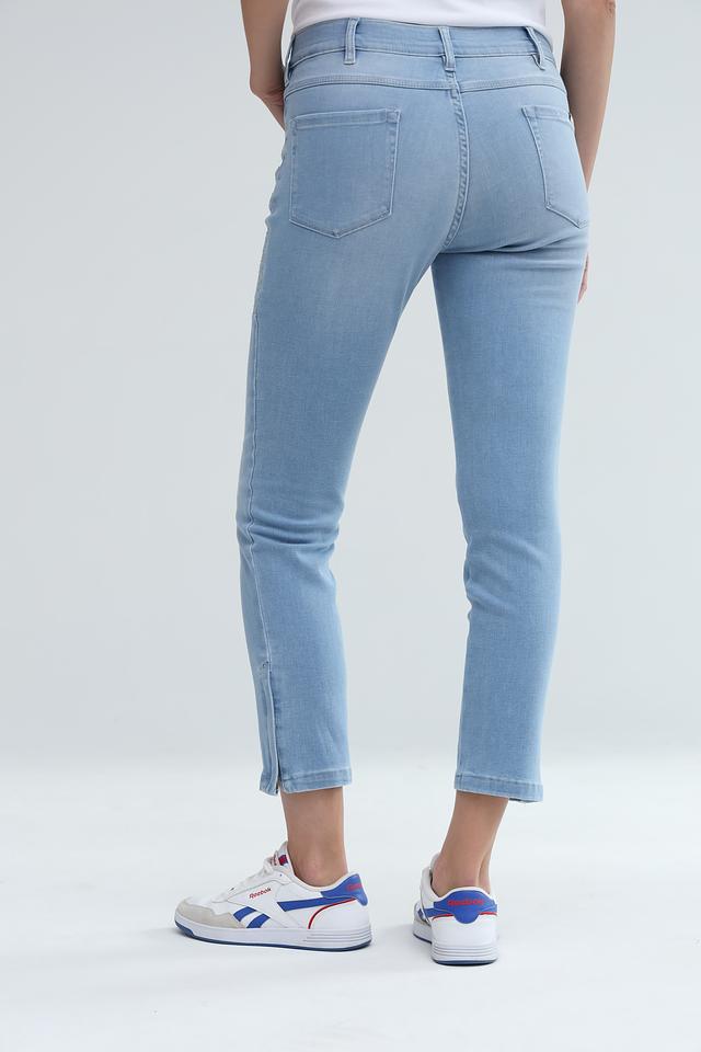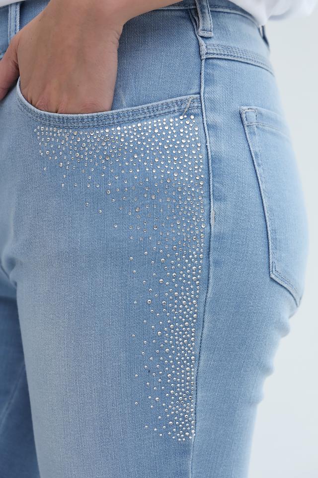 Особенностью этих джинсов является деликатный декор из кристаллов, расположенный на карманах и вдоль боковой линии. Этот акцент придает изделию изысканность и индивидуальность.