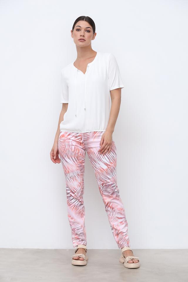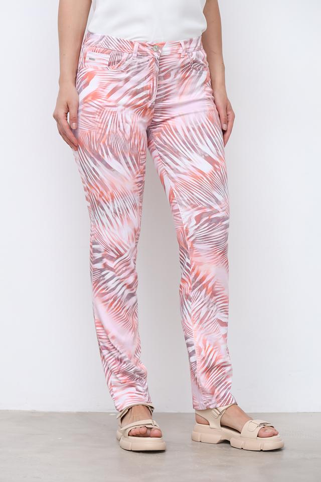 Женские брюки Zerres персикового цвета с оригинальным принтом в виде листьев станут ярким акцентом вашего образа. Модель выполнена из мягкого хлопка с добавлением полиэстера и эластана для комфорта и удобства. Состав: хлопок 71%, полиэстер 26%, эластан 3%