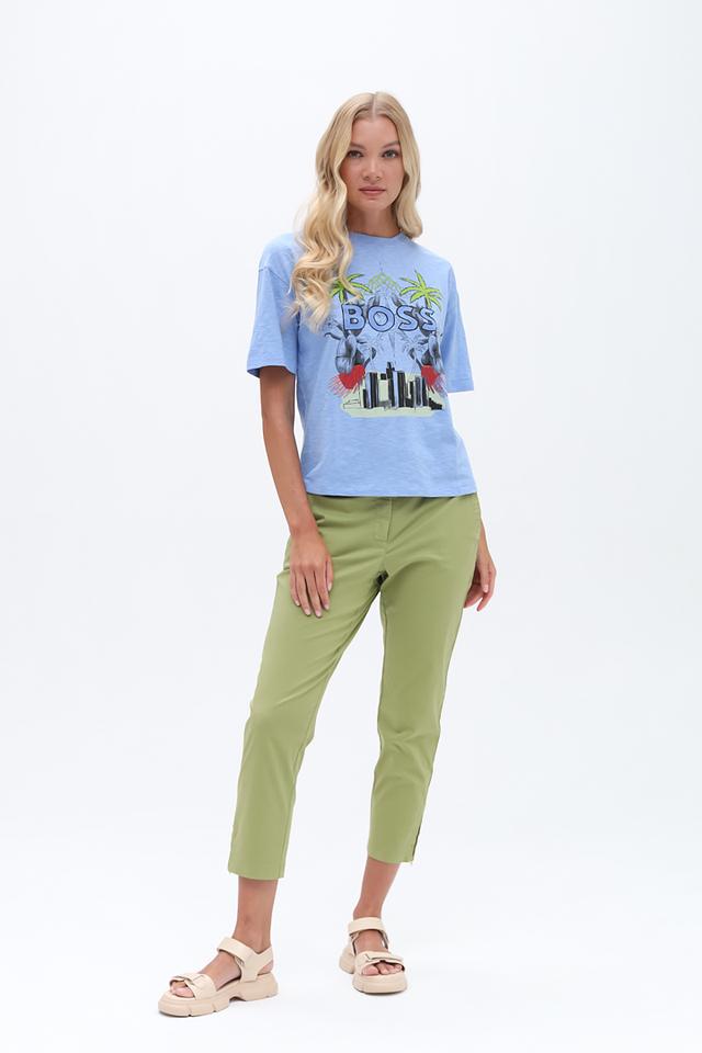 Брюки имеют прямой крой и укороченную длину, что делает их идеальными для создания модных образов в тёплое время года. Застежка на молнию и пуговицу обеспечивает надежную фиксацию. Наличие функциональной молнии на щиколотке добавляет брюкам оригинальности и позволяет регулировать ширину штанины.