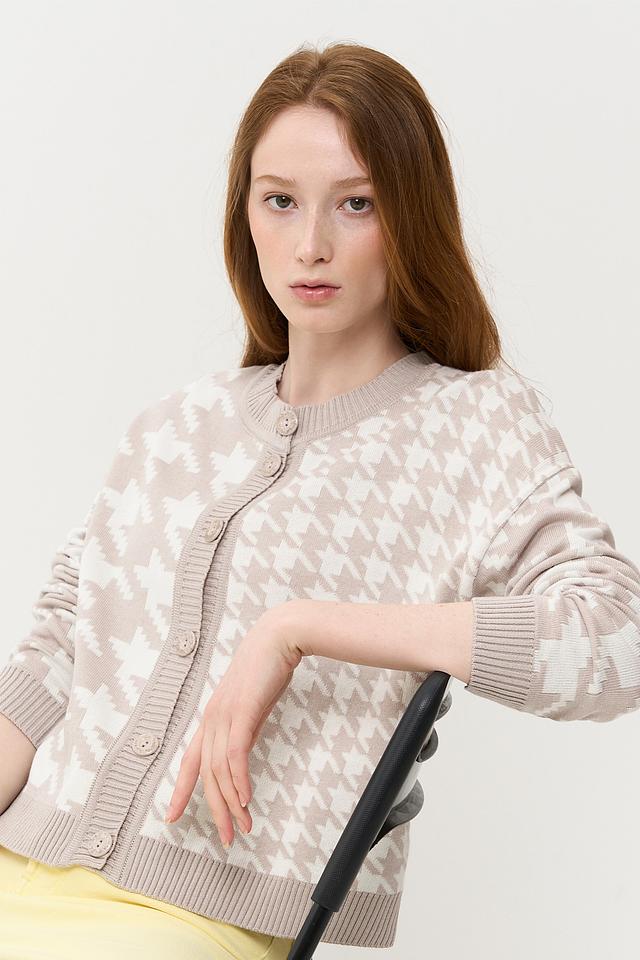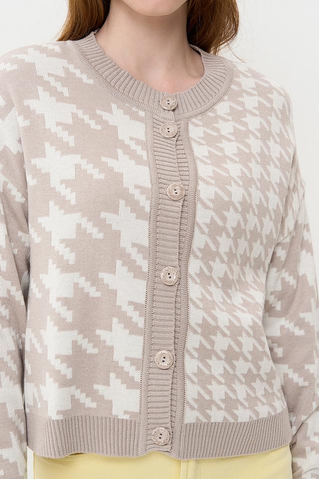 Кардиган имеет укороченный крой и застегивается на пуговицы по всей длине. Особенность модели – актуальный геометрический рисунок в клетку, выполненный в бежевых и белых тонах. Вязаная текстура добавляет изделию уют и объём.