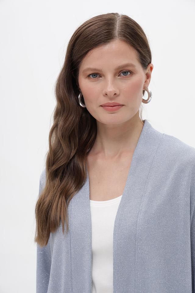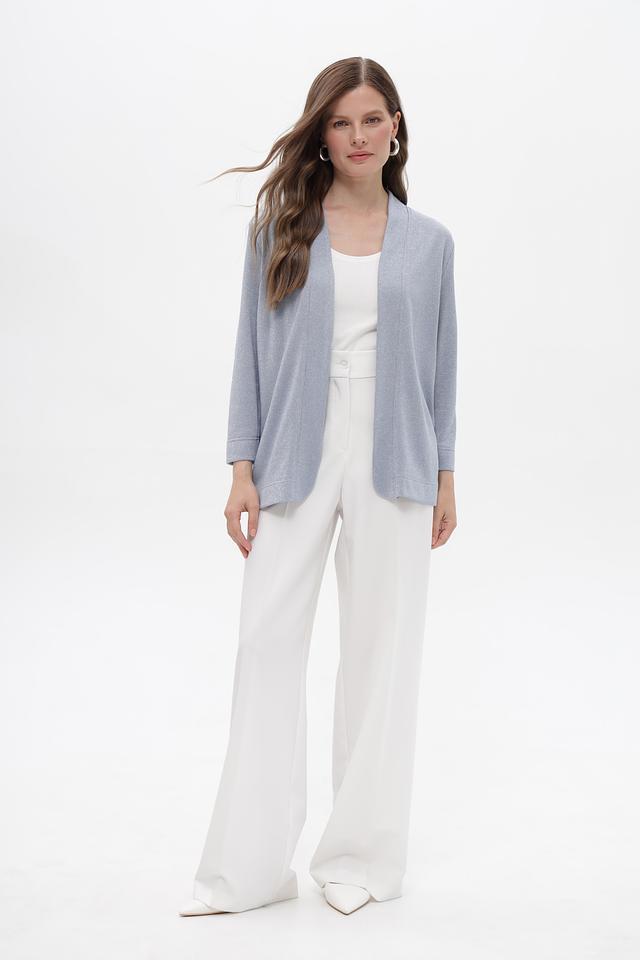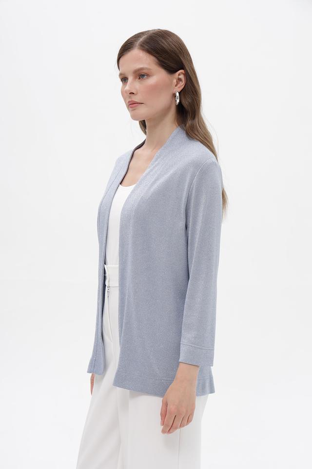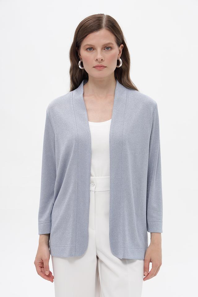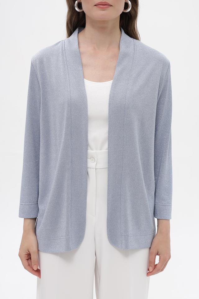 Жакет Bianca голубого цвета с добавлением металлизированной нити станет стильным дополнением к вашему гардеробу. Модель имеет свободный крой и короткий рукав 3/4, что делает ее универсальной для создания различных образов. Состав: вискоза 82%, метализ.нить 18%