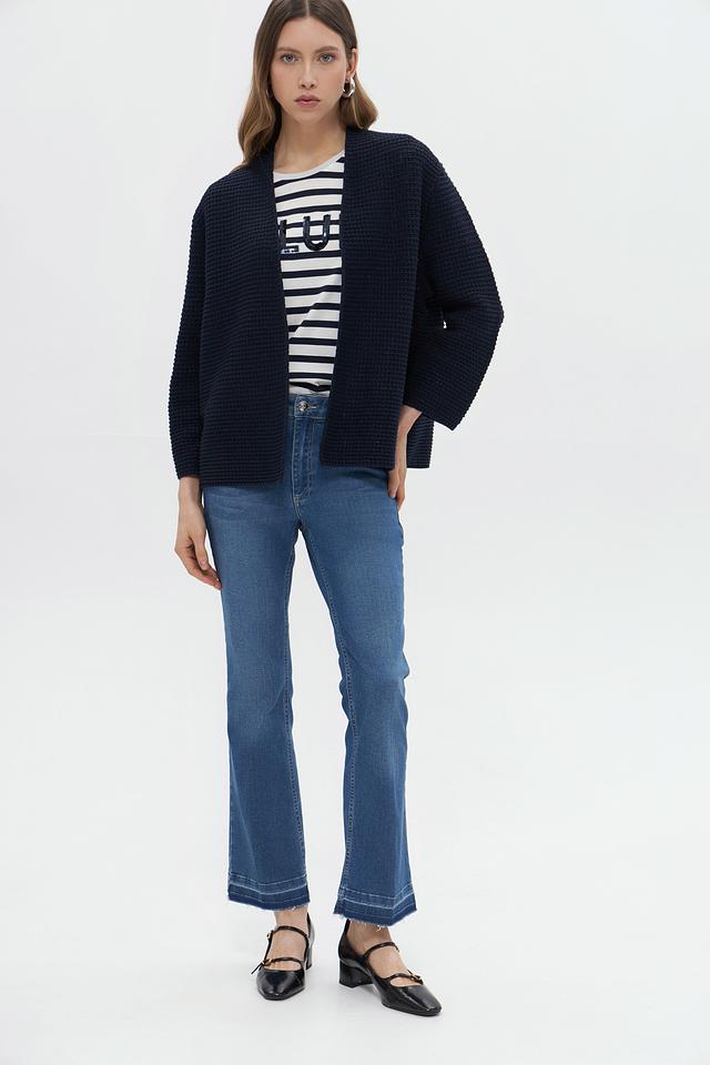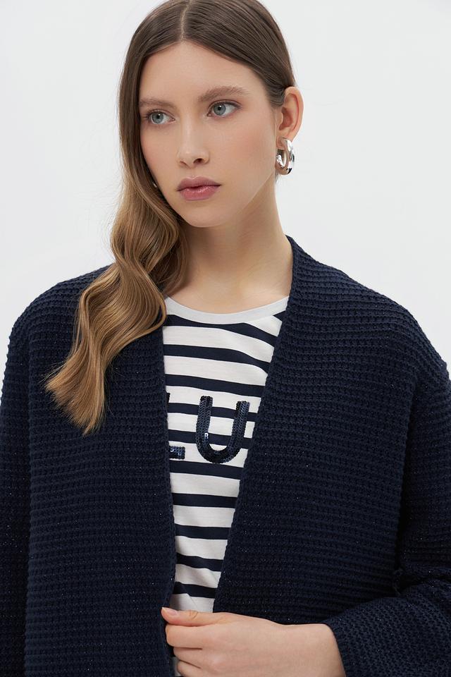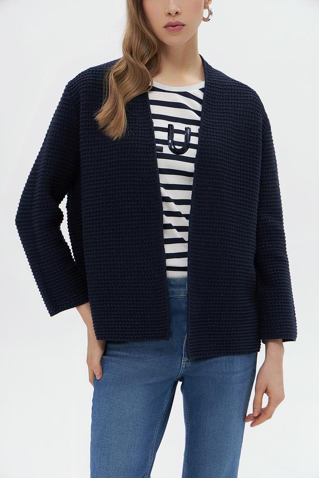 Тёмно-синий вязаный жакет от Bianca – стильное и комфортное решение для создания повседневных образов. Модель имеет свободный крой и текстурную вязку, что придает ей особый шарм. Состав: хлопок 55%, полиакрил 37%, метализ.нить 8%