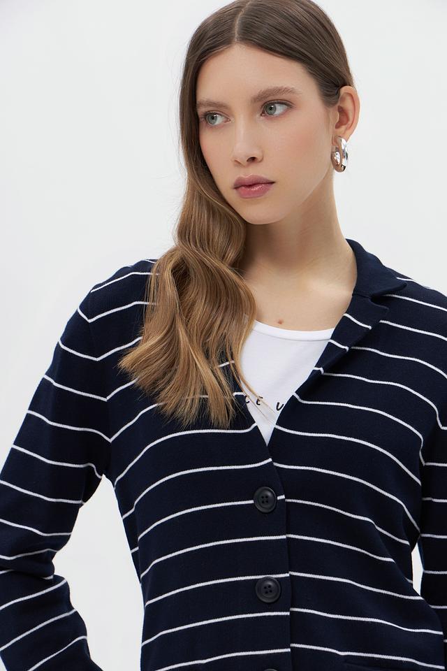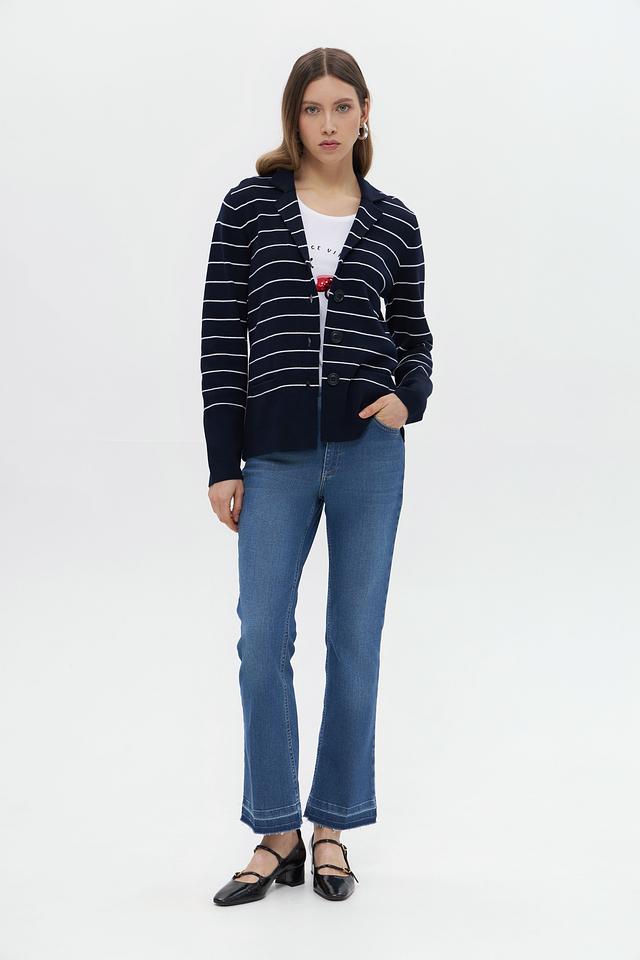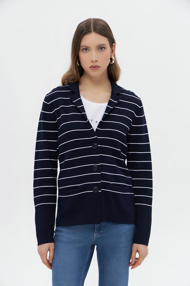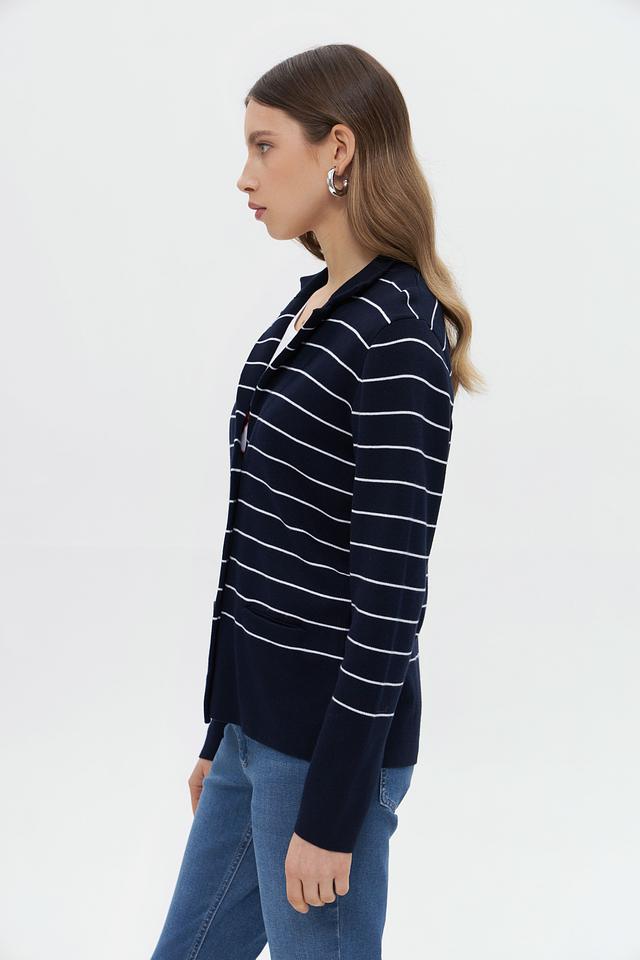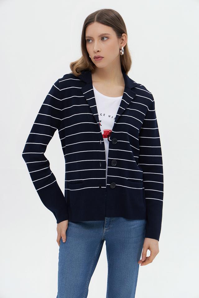 Жакет Bianca темно-синего цвета в белую полоску – стильное и комфортное решение для создания повседневных образов. Изготовлен из хлопка с добавлением модала и полиамида, что обеспечивает приятные тактильные ощущения и удобство в носке. Состав: хлопок 50%, модал 40%, полиамид 10%