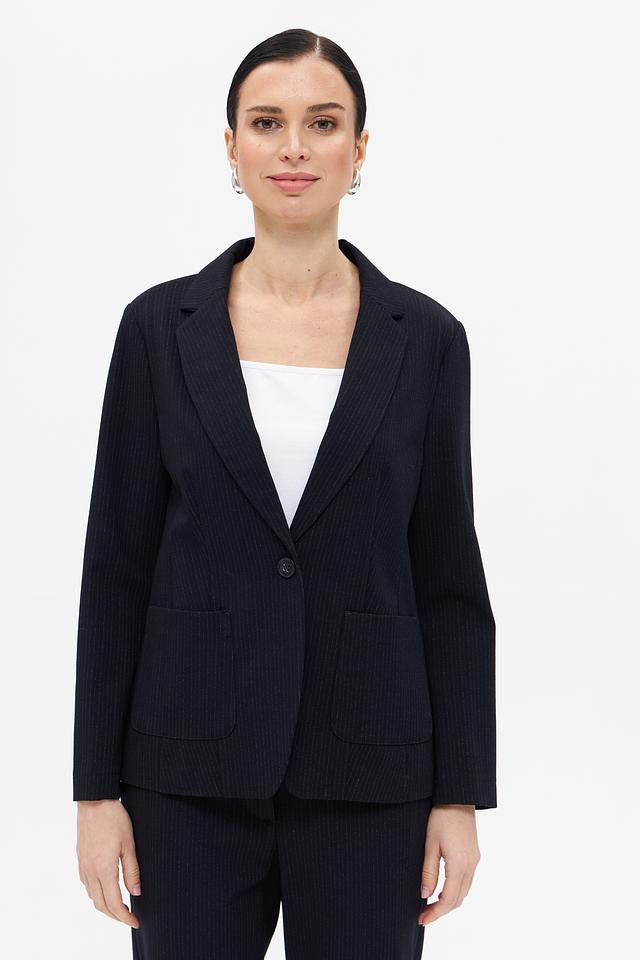 Жакет имеет классический крой с лацканами, застегивается на одну пуговицу. Накладные карманы добавляют практичности. Длинные рукава и приталенный силуэт подчеркивают фигуру.