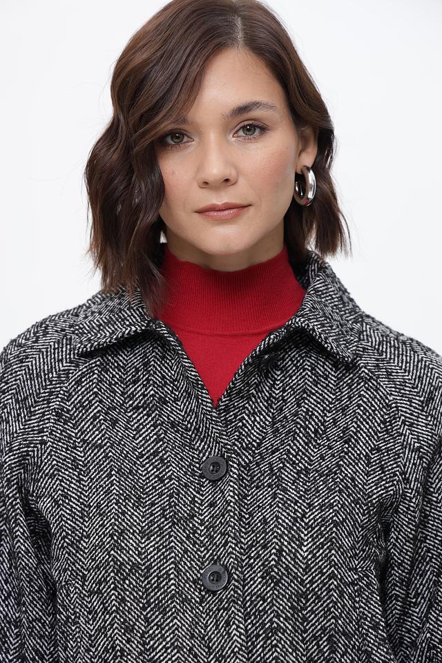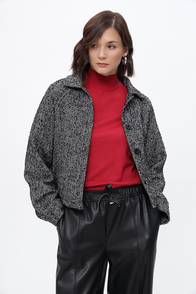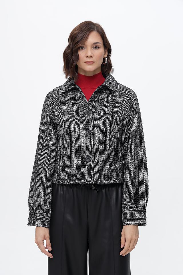 Модель застёгивается на пуговицы и имеет отложной воротник. Длинные рукава и свободный силуэт обеспечивают комфортную посадку. Жакет идеально сочетается с брюками, юбками и платьями, позволяя создавать разнообразные образы.