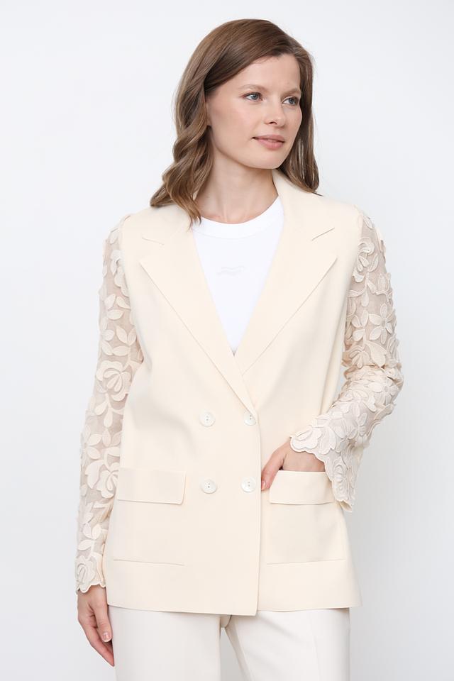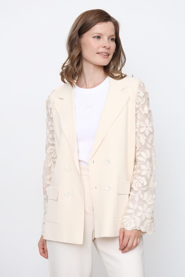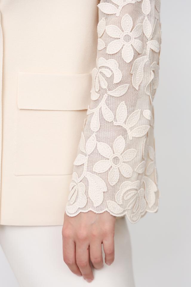 Особенностью модели являются рукава, выполненные из изящного кружева с цветочным узором. Кружево придает жакету женственность и элегантность. Жакет хорошо сочетается с брюками, юбками и платьями, позволяя создавать разнообразные образы.