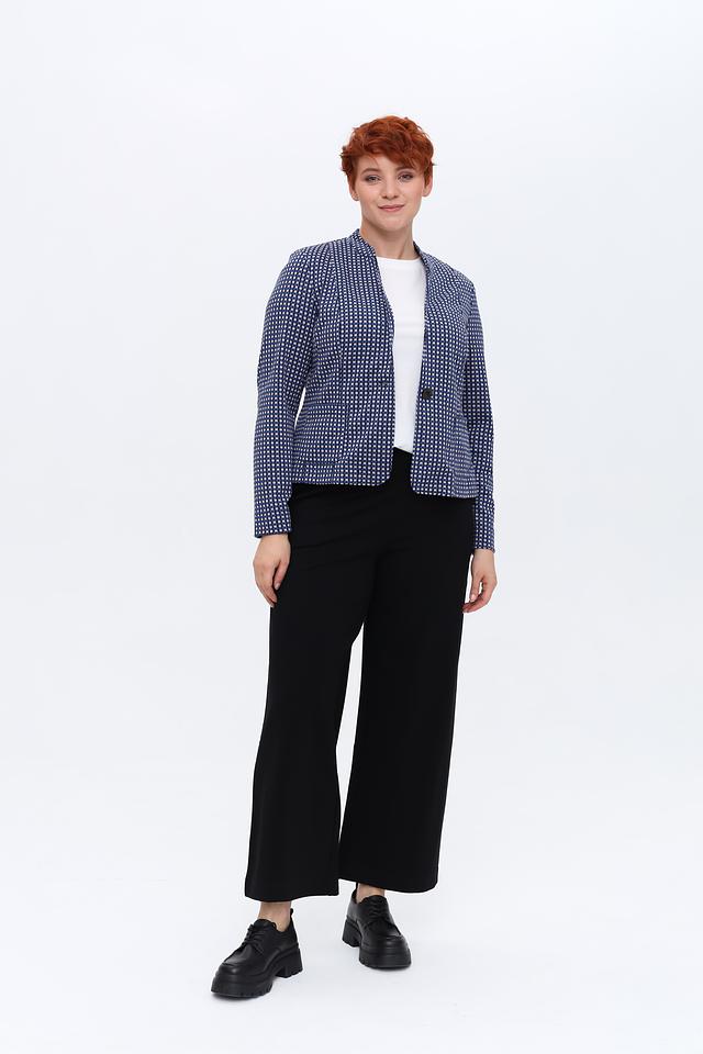 Жакет Erfo синего цвета с мелким белым рисунком – стильное и удобное решение для создания элегантного образа. Классический крой и однобортная застёжка на пуговицу делают этот жакет универсальным дополнением к любому гардеробу. Состав: полиэстер 71%, вискоза 28%, эластан 1%