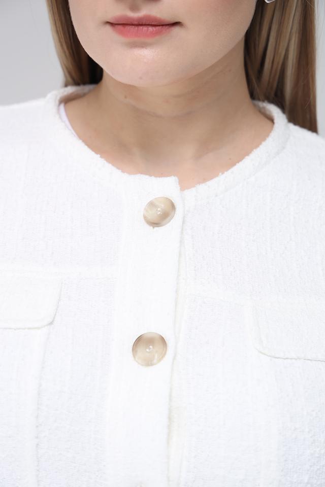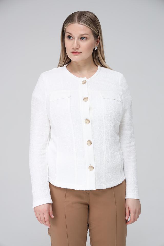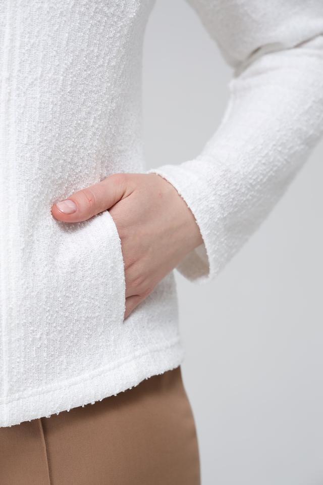 Модель дополнена двумя накладными карманами на передней части, которые придают ей функциональность и стильный вид. Фактурная ткань жакета добавляет изысканности и делает его особенным.