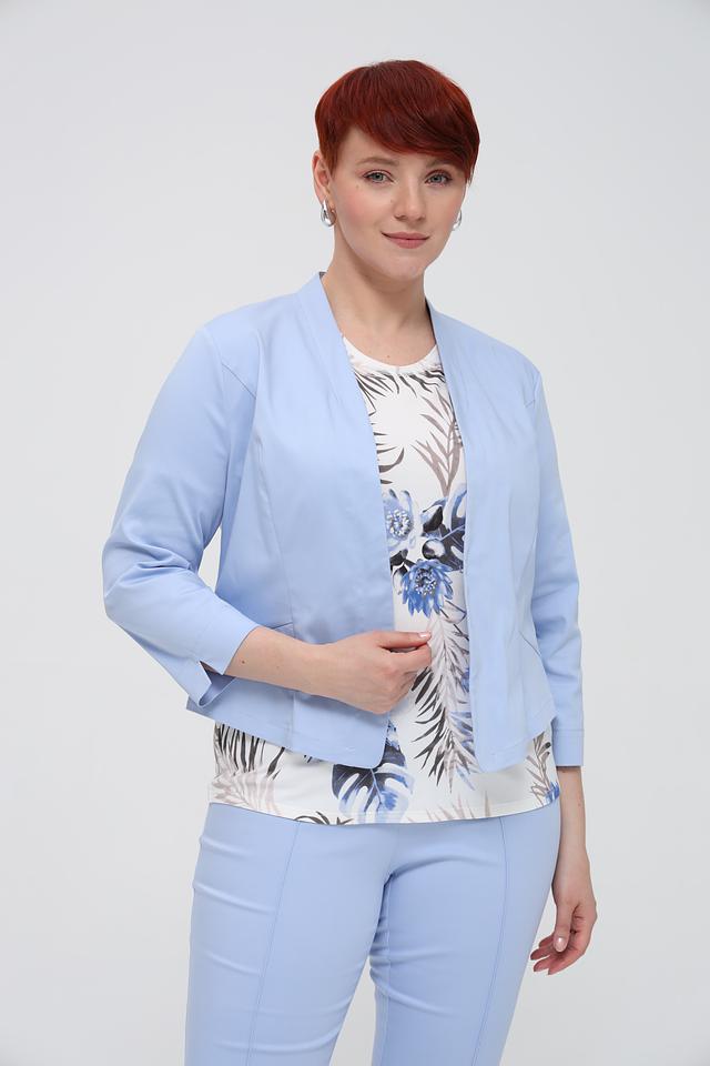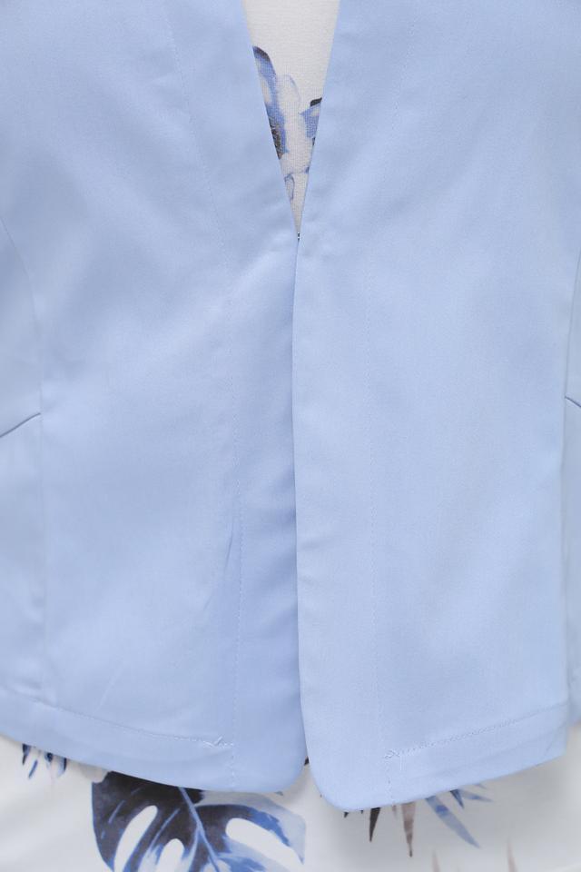 Жакет имеет приталенный силуэт, который подчеркивает фигуру, и короткий рукав 3/4, что делает его актуальным и модным. Отсутствие застежек и воротник-стойка придают модели лаконичность и элегантность.
