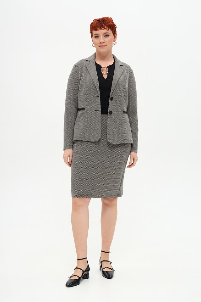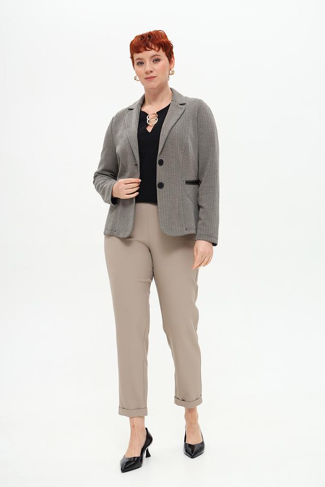 Жакет имеет застежку на две пуговицы, а также два функциональных кармана с клапанами. Сочетание полиэстера, вискозы и эластана в составе обеспечивает приятные тактильные ощущения, хорошую посадку по фигуре и устойчивость к сминанию.