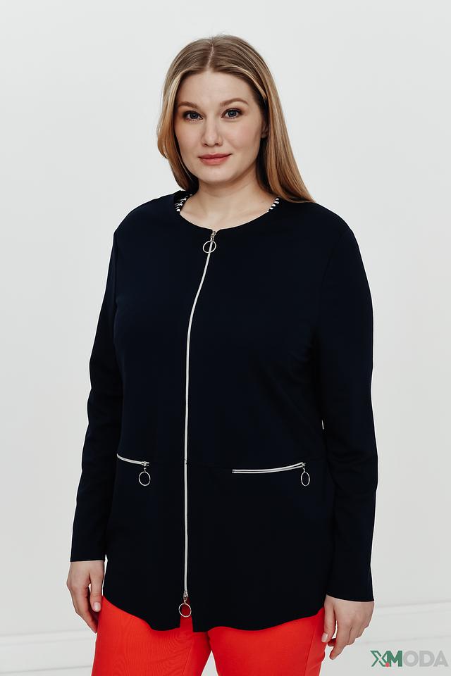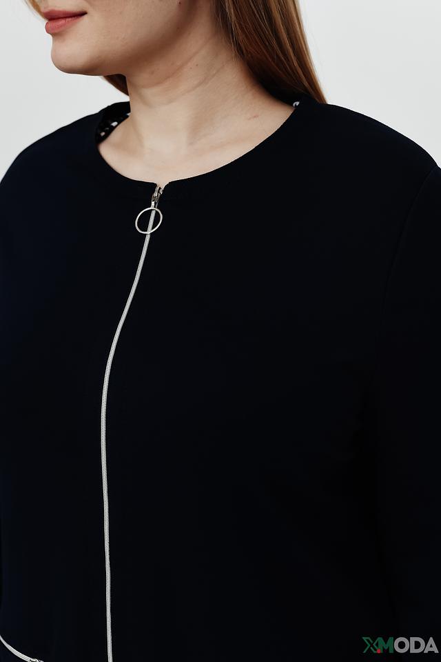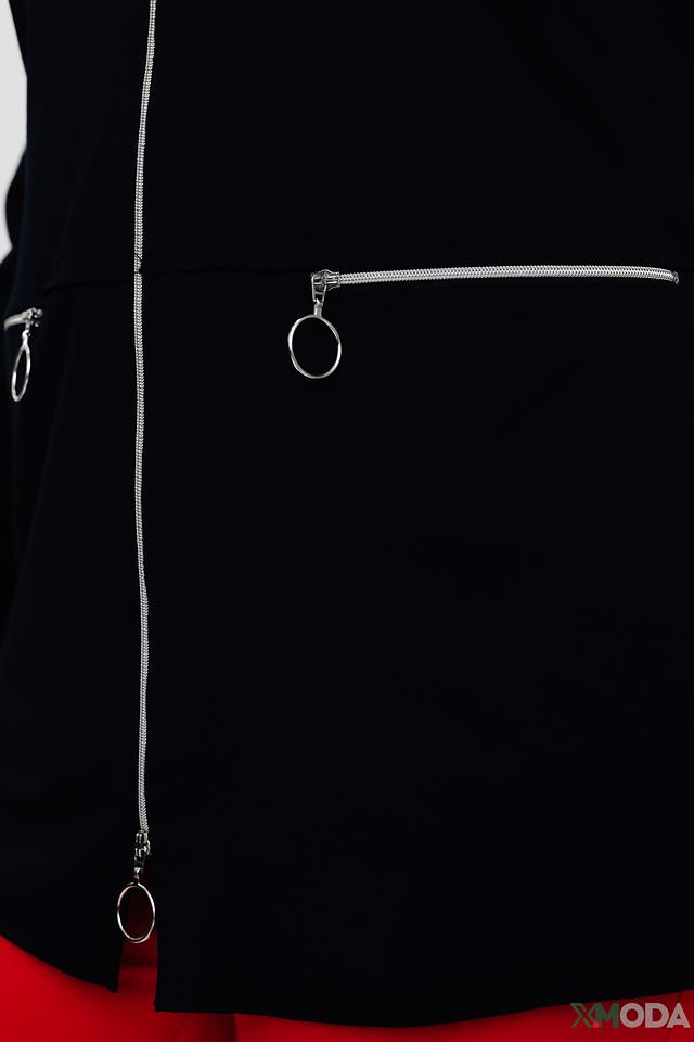Жакет имеет удобную застежку на молнию, украшенную белыми металлическими пуллерами, что придает ему современный вид. Боковые карманы также оформлены молниями в тон основной ткани.
