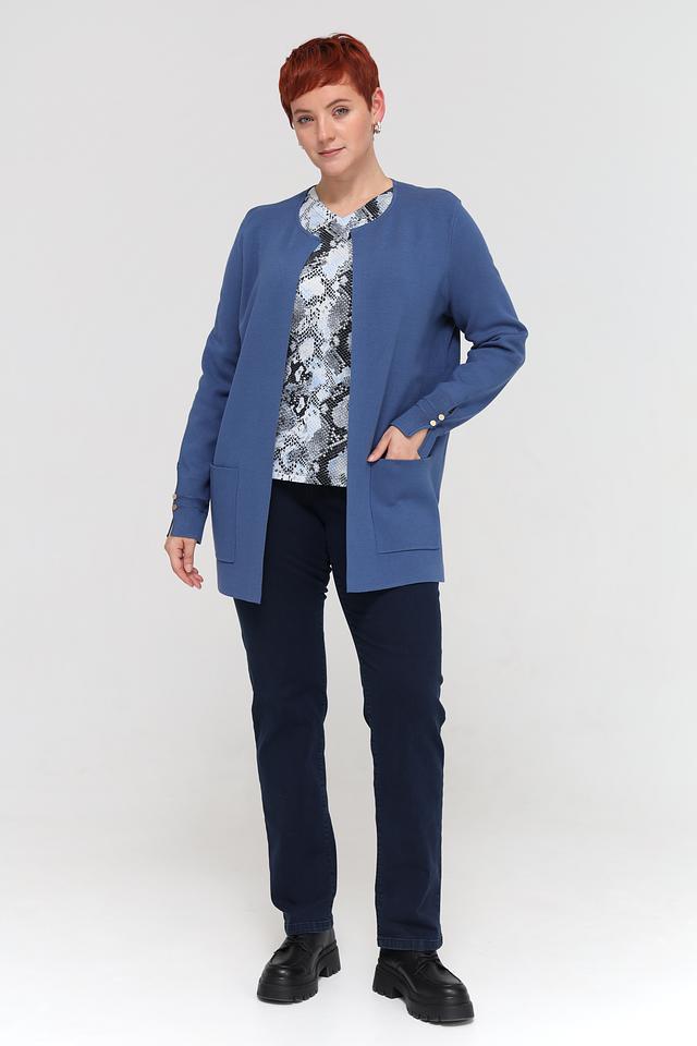Модель имеет прямой крой, который обеспечивает комфортную посадку по фигуре. Жакет без застежки, что делает его легким и удобным в носке.