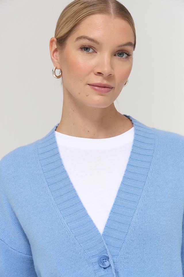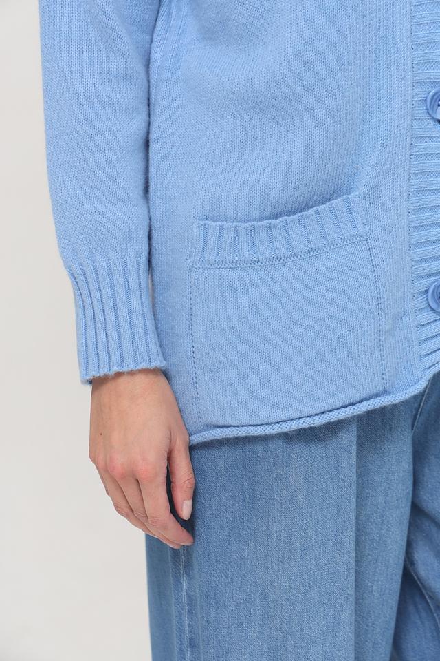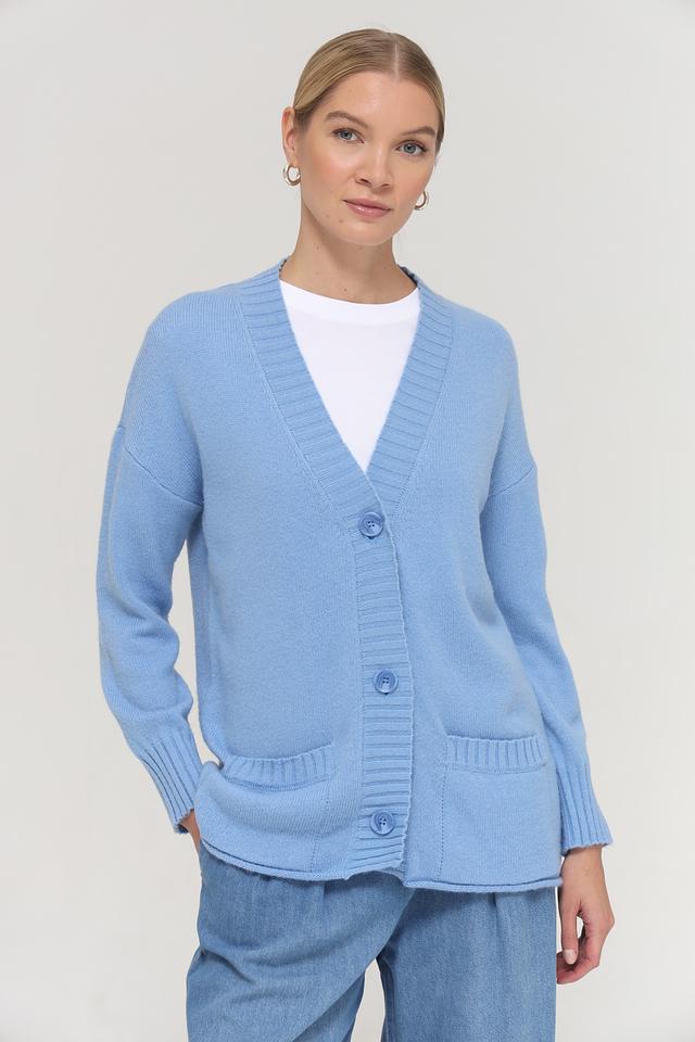 Жакет имеет классический V-образный вырез и застегивается на пуговицы. Удобные карманы делают его практичным и функциональным. Модель выполнена из мягкого трикотажа, который приятен к телу и обеспечивает комфорт в носке.