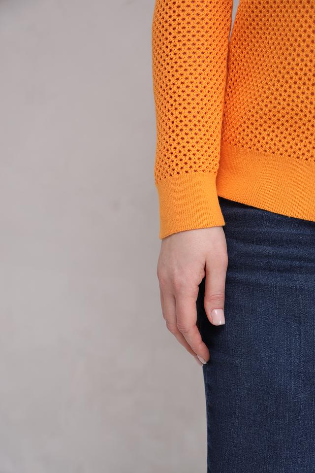 Этот стильный жакет от Lebek станет отличным дополнением к вашему гардеробу. Яркий оранжевый цвет и ажурный трикотаж делают его особенным и привлекательным.