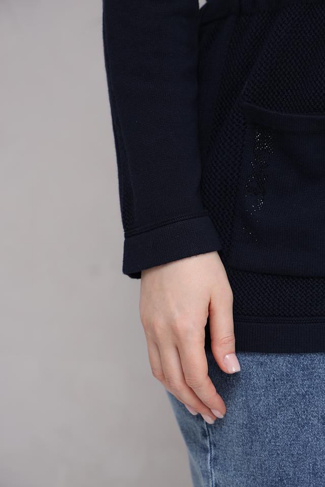 Жакет имеет оригинальный дизайн благодаря сочетанию гладкой ткани и текстурной вставки из сетки на передней части. Пояс позволяет подчеркнуть талию и создать более женственный силуэт. Боковые карманы добавляют функциональности.