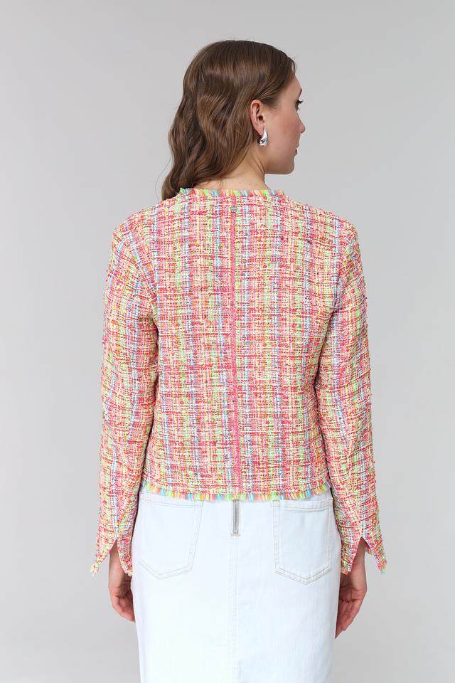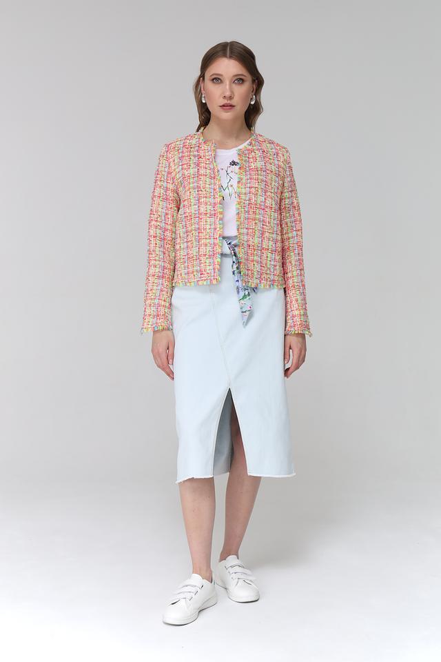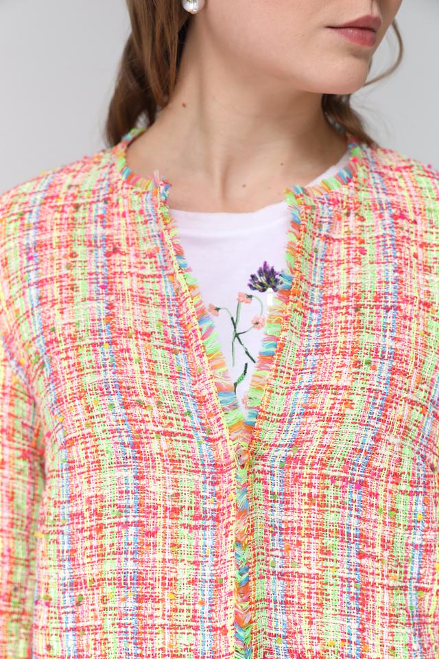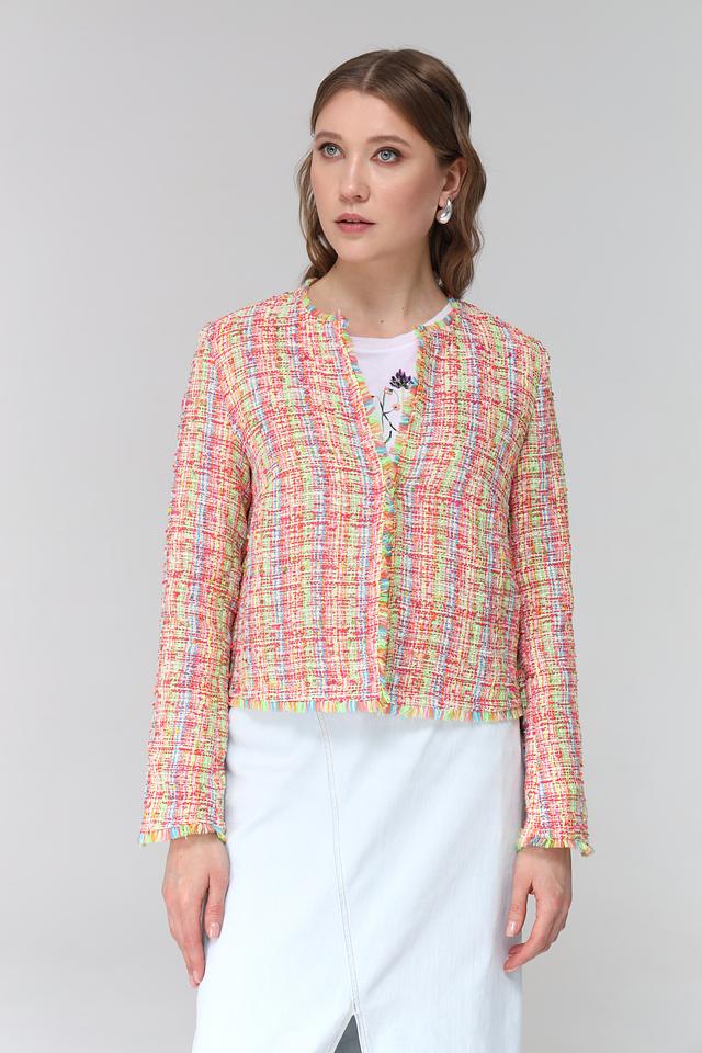 Жакет имеет короткий рукав и классический силуэт. Отделка по краям изделия выполнена в виде бахромы, что придает ему легкость и динамичность.