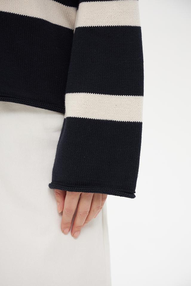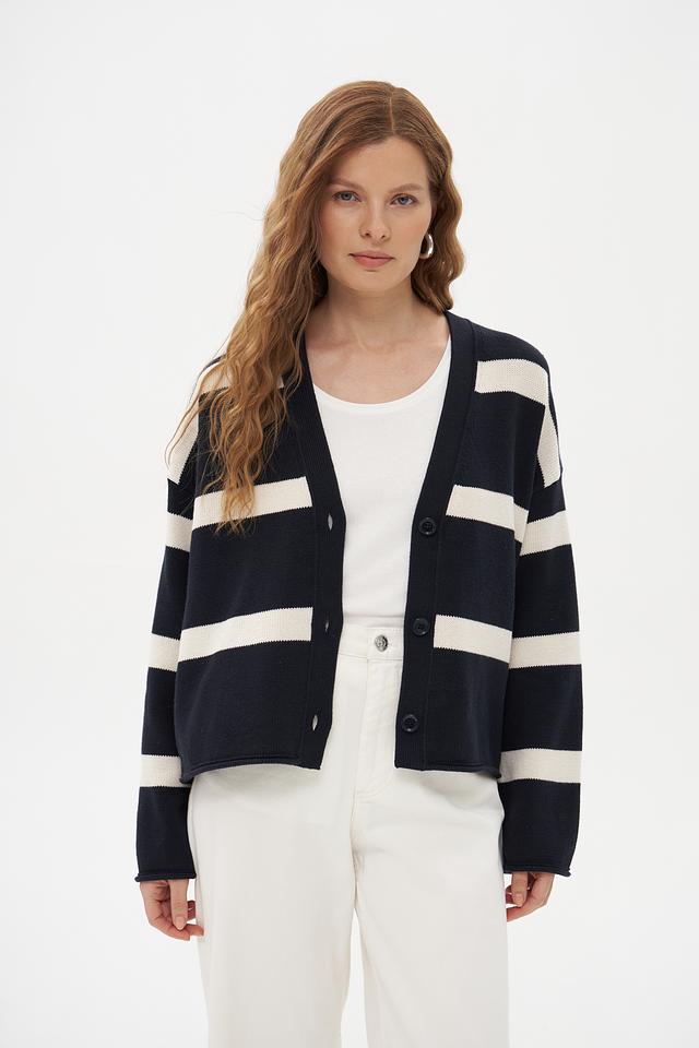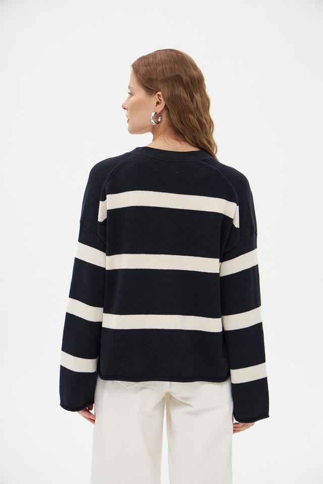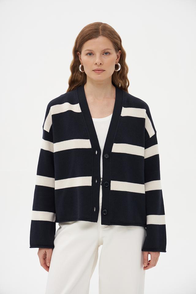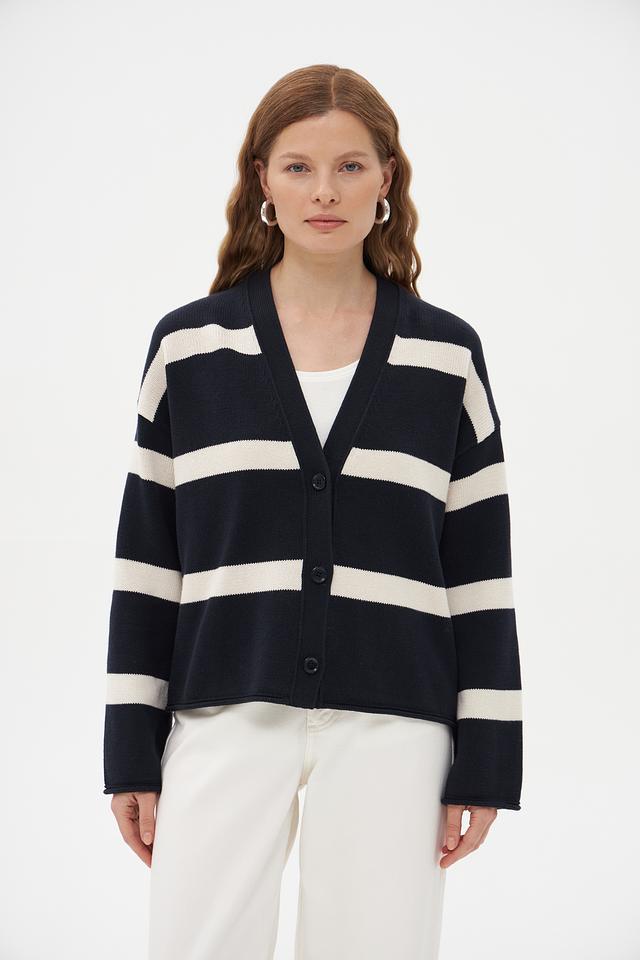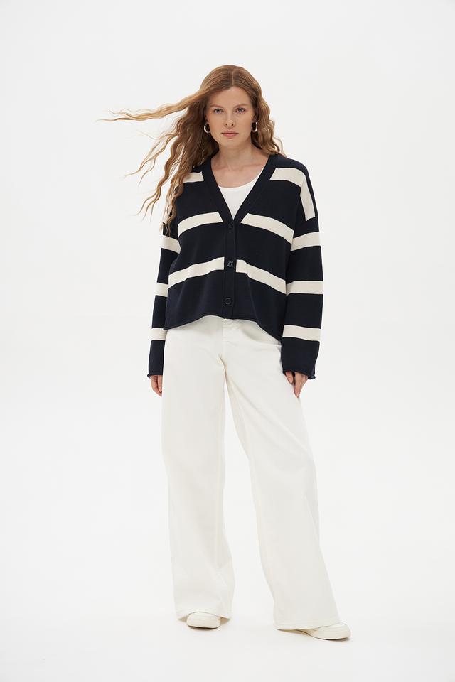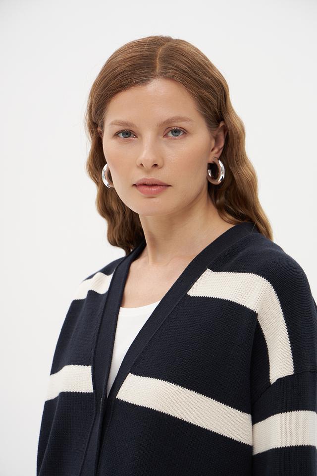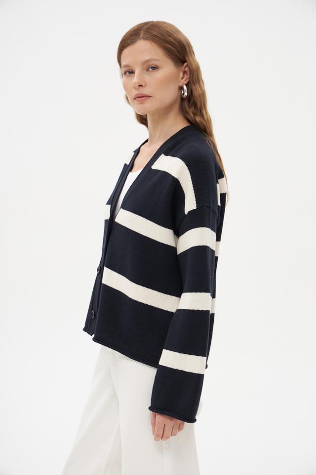 Жакет имеет классический крой и V-образный вырез, который визуально удлиняет шею. По всему изделию проходит горизонтальная полоска темно-синего и белого цветов, создающая стильный и современный образ.