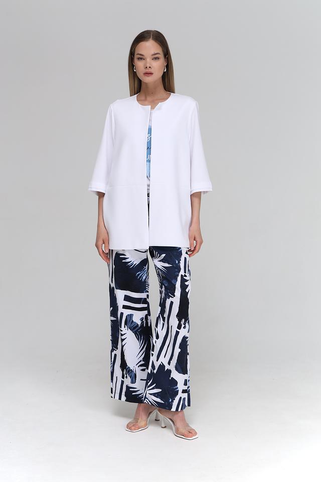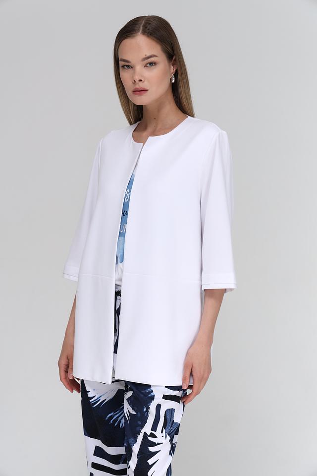 Жакет имеет прямой крой, который подчеркивает фигуру, но не сковывает движения. Короткий рукав 3/4 делает его идеальным для теплой погоды или для ношения в помещении. Отсутствие застежек обеспечивает комфорт и легкость в надевании.