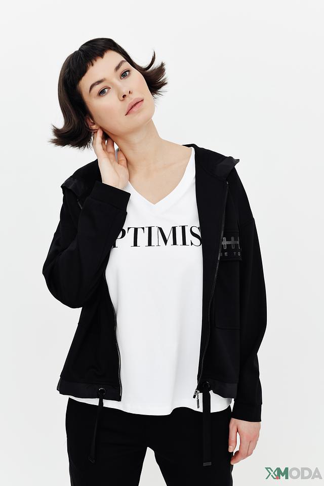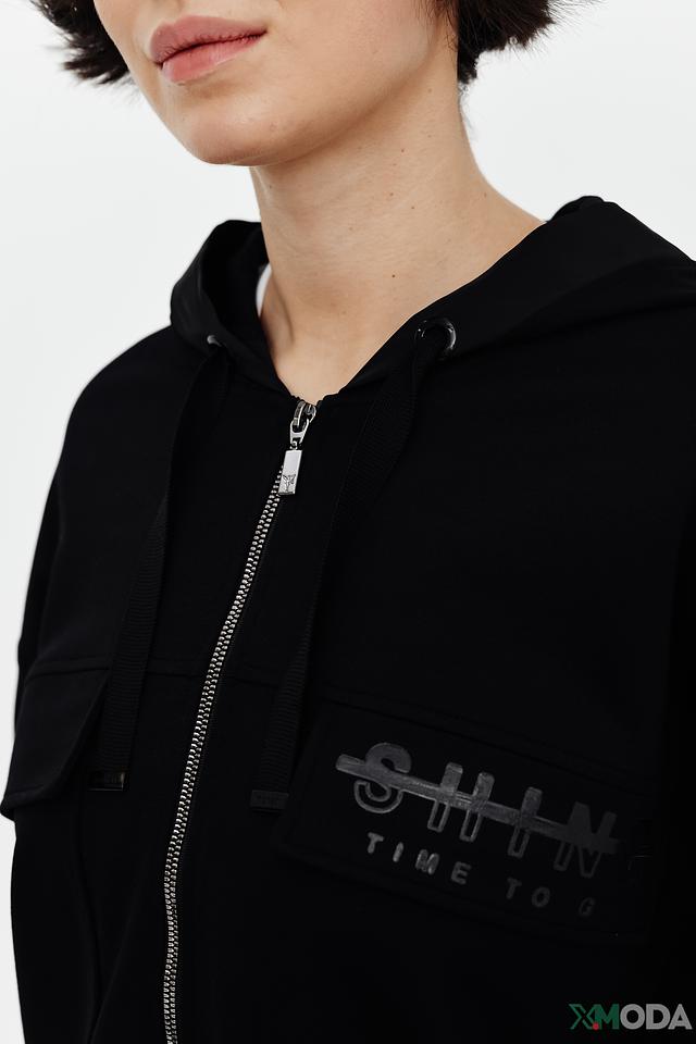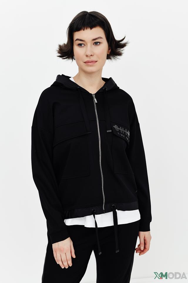 Чёрный жакет Monari с капюшоном и застёжкой-молнией – стильное и удобное решение для создания повседневных образов. Модель выполнена из мягкой ткани с добавлением вискозы, полиэстера и эластана, обеспечивающих комфорт и свободу движений. Состав: вискоза 85%, полиэстер 10%, эластан 5%
