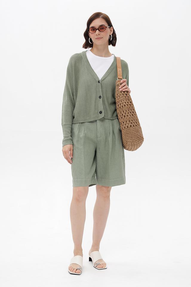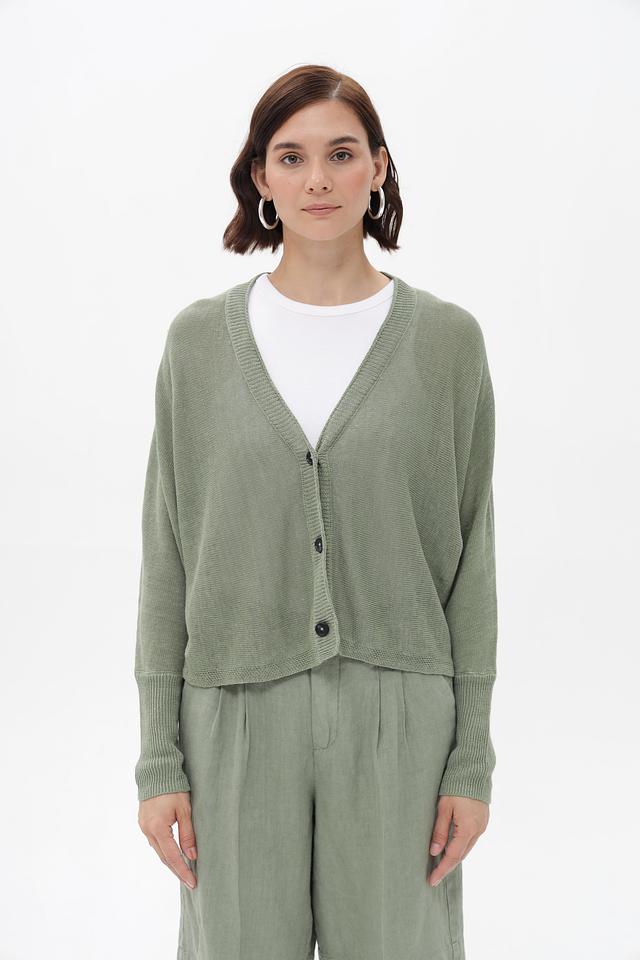 Кардиган выполнен из 100% льна, что обеспечивает комфорт и воздухопроницаемость в теплую погоду. Приталенный силуэт подчеркивает фигуру, а манжеты на рукавах придают изделию аккуратный вид.
