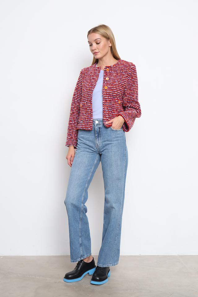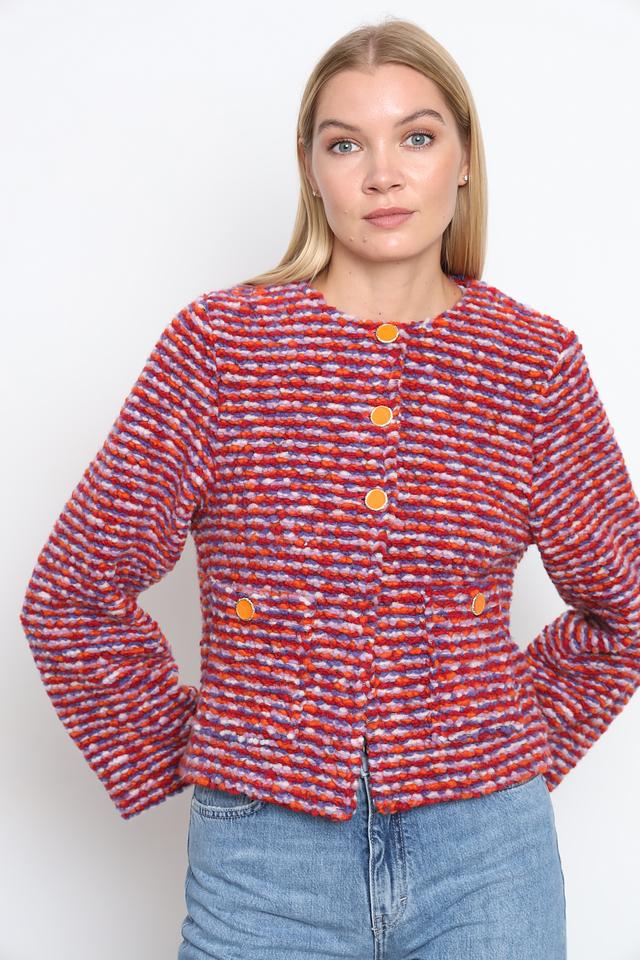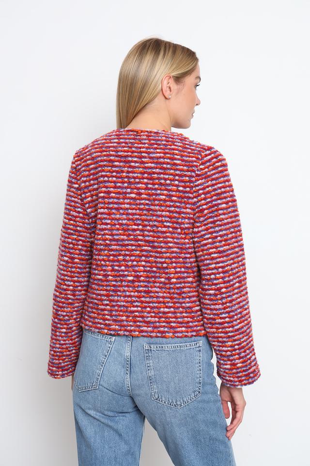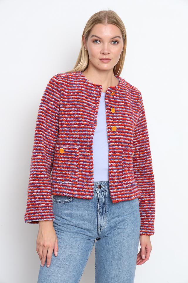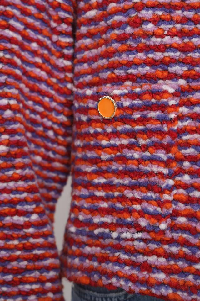 Этот жакет от Rich and Royal станет ярким акцентом в вашем образе. Модель выполнена в технике жаккардового плетения, сочетающего в себе несколько цветов: красный, оранжевый, синий и фиолетовый. Благодаря этому, жакет выглядит необычно и привлекательно.