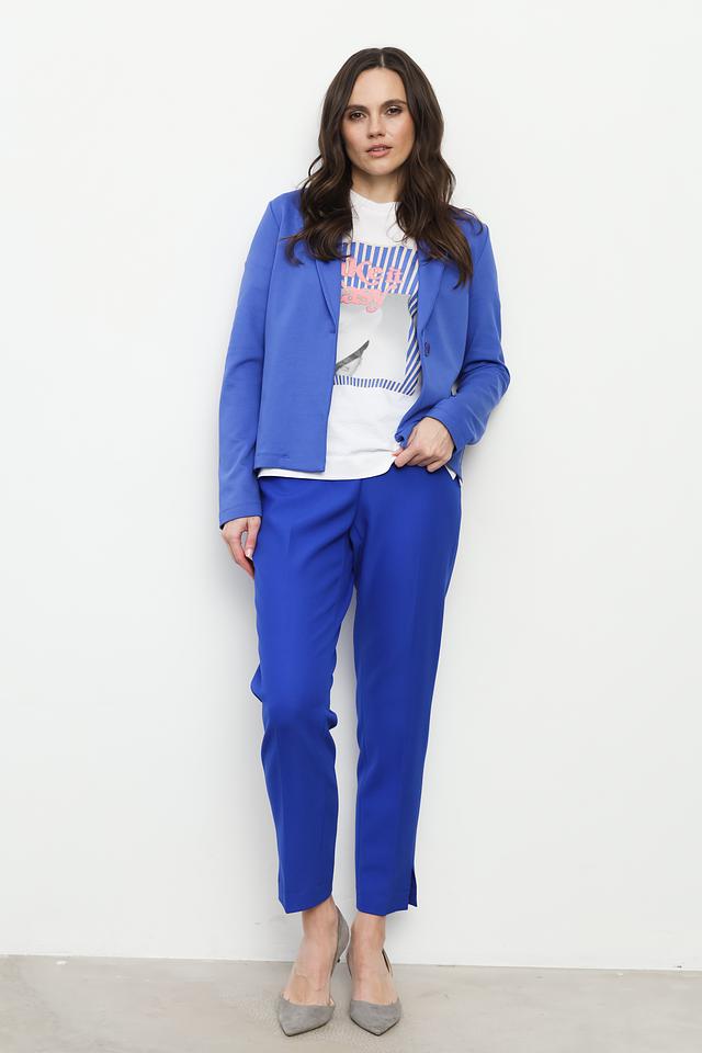Жакет застегивается на две пуговицы, что позволяет регулировать степень прилегания. Отложной воротник придает образу элегантность и завершенность. Жакет выполнен из приятной на ощупь ткани, состоящей из 75% вискозы, 21% полиамида и 4% эластана.