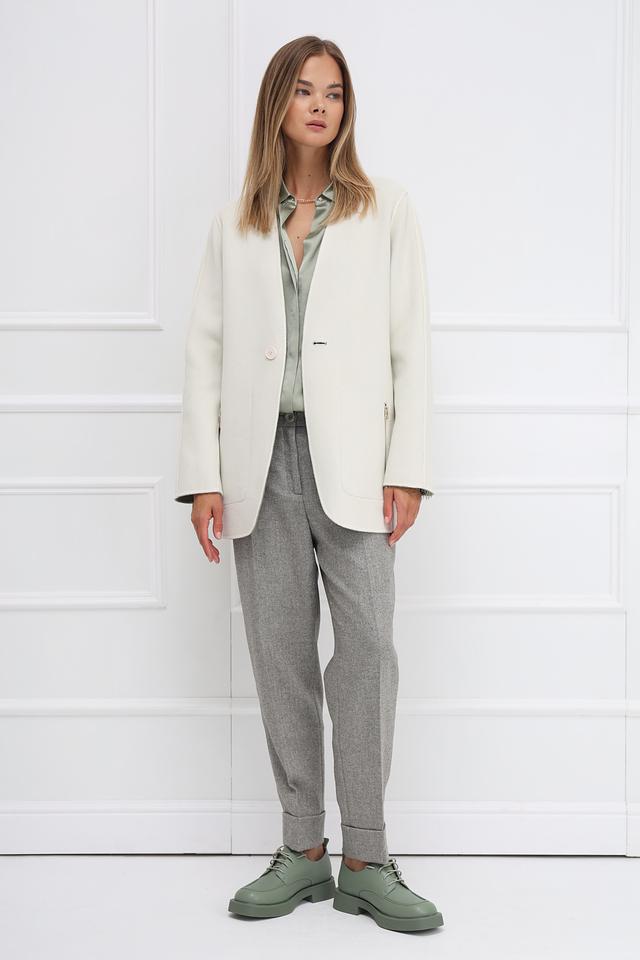 Дизайн жакета лаконичен и элегантен. Накладные карманы добавляют практичности, а однотонная текстура подчеркивает благородство материала. Застежка на одну пуговицу обеспечивает удобство ношения.