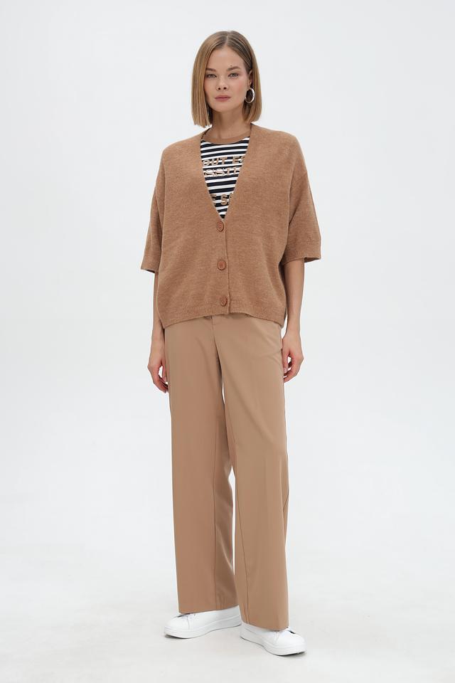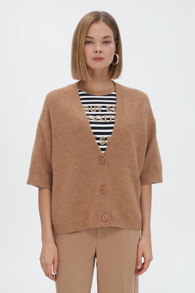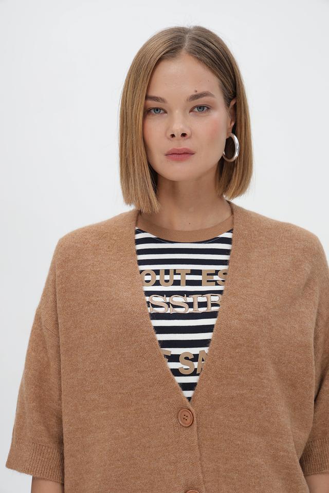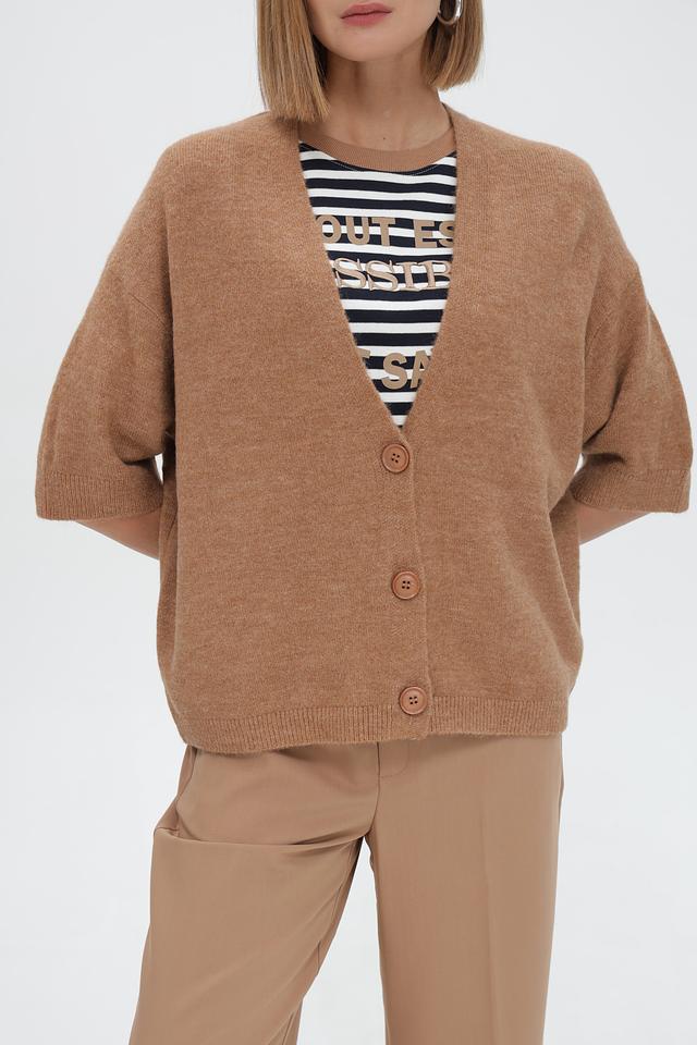 Бежевый жакет Steilmann свободного кроя с короткими рукавами и V-образным вырезом. Модель застегивается на пуговицы и выполнена из мягкого вязаного полотна, что обеспечивает комфорт и удобство в носке. Состав: полиакрил 60%, полиамид 29%, шерсть 8%, эластан 3%