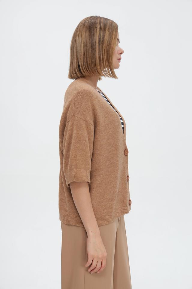 Жакет имеет свободный крой, короткие рукава и V-образный вырез. Застежка на пуговицы позволяет регулировать степень прилегания. Бежевый цвет делает его универсальным и легко сочетаемым с различными элементами одежды.
