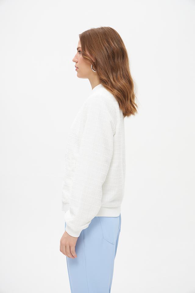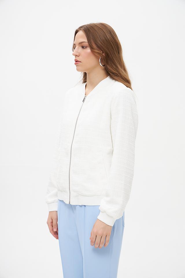 Жакет имеет стеганую фактуру, которая придает ему особый шарм и текстуру. Застежка-молния обеспечивает удобство и надежность. Воротник-стойка добавляет современный акцент. Длинные рукавы делают жакет подходящим для прохладной погоды.