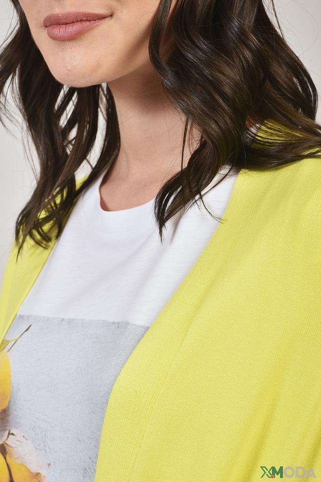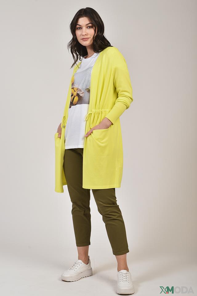 Этот жакет от Taifun выполнен в ярком лаймовом цвете и станет отличным дополнением к вашему гардеробу. Модель представляет собой кардиган-кимоно свободного кроя, что обеспечивает максимальный комфорт в носке.