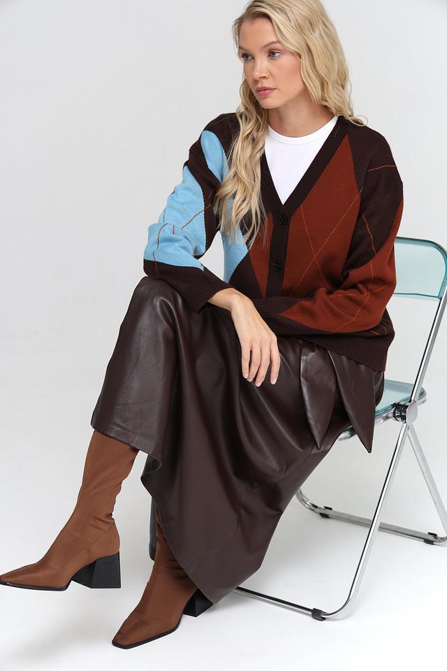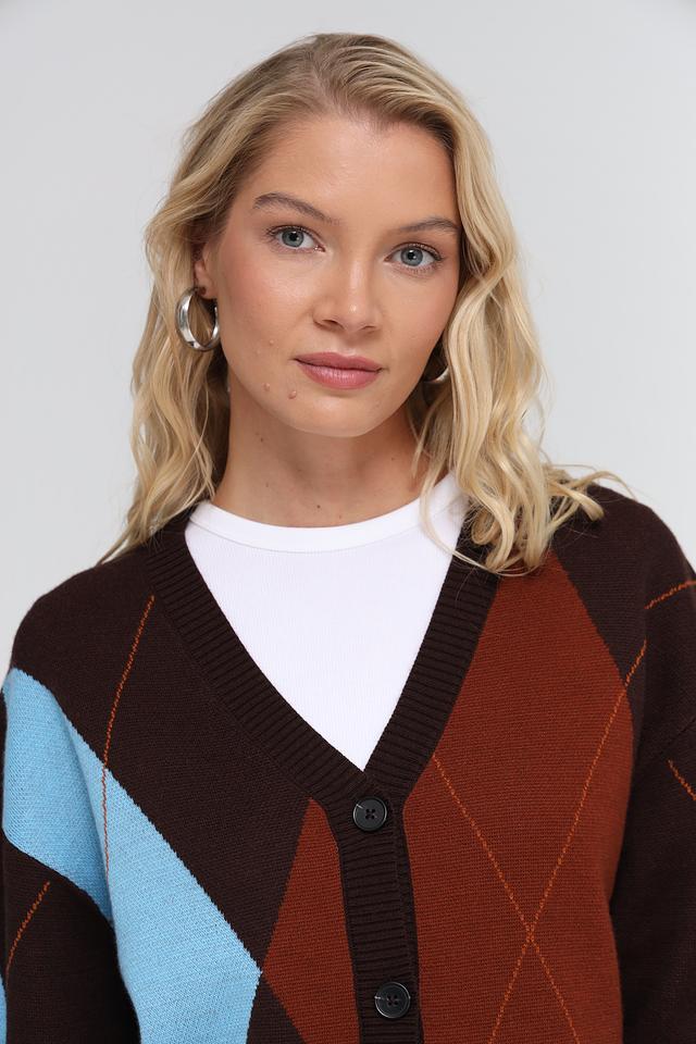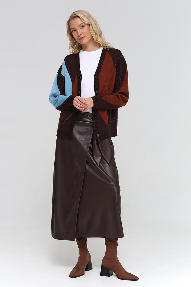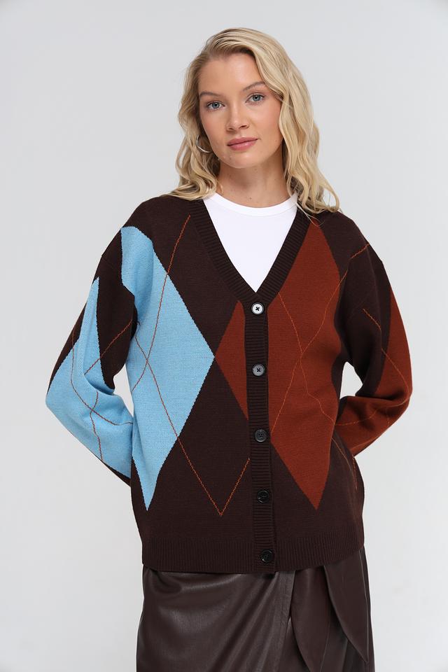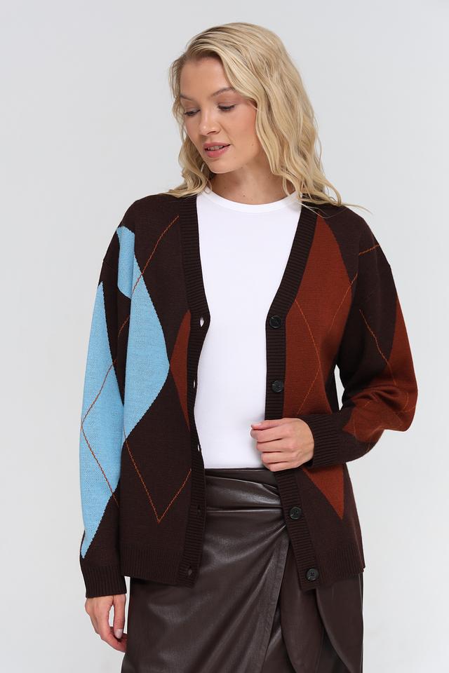 Женский жакет UNQ коричневого цвета с геометрическим узором "ромб" выполнен из мягкой пряжи с добавлением шерсти. Модель застегивается на пуговицы и имеет V-образный вырез. Состав: полиакрил 50%, шерсть овечья 50%