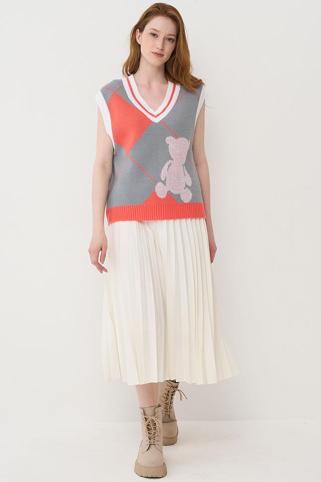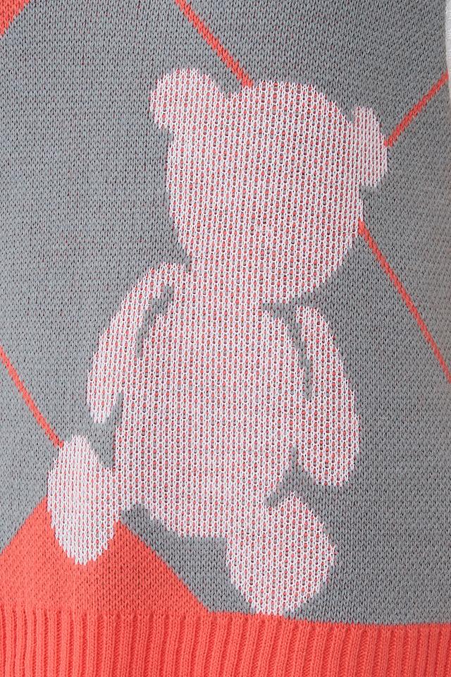 Жилет имеет V-образный вырез и свободный крой, что обеспечивает комфортную посадку по фигуре. Оригинальный принт в виде милого медвежонка добавляет образу игривости и индивидуальности.