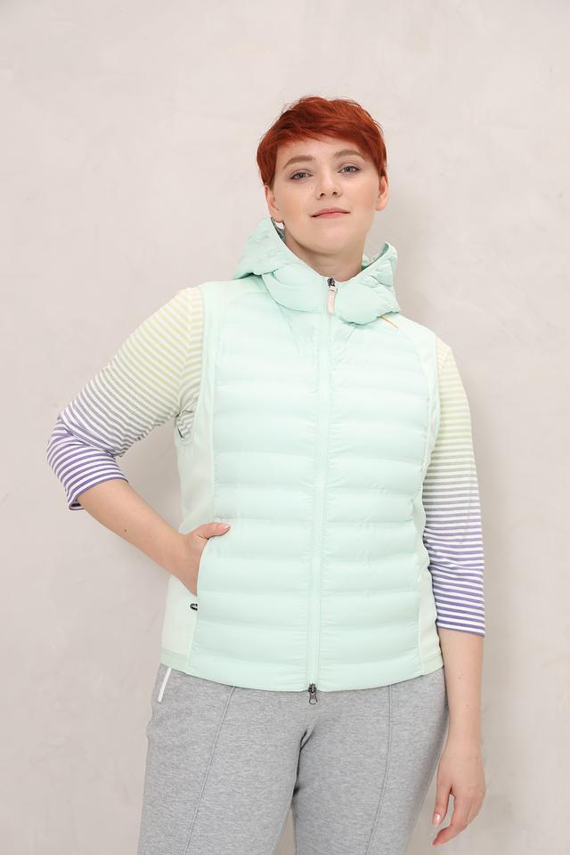 Жилет имеет удобный капюшон, который защитит от ветра и небольшого дождя. Застежка-молния позволяет легко надевать и снимать жилет, а также регулировать степень теплоизоляции.