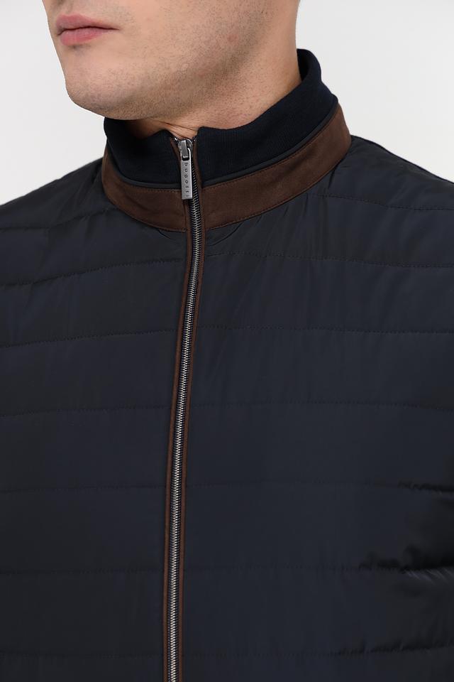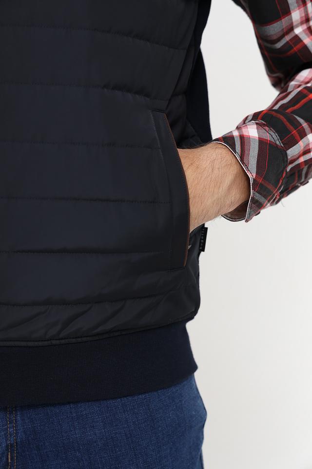Мужской жилет Bugatti темно-синего цвета, выполнен из хлопка с добавлением полиэстера. Модель стеганая, с воротником-стойкой и застежкой-молнией. Состав: хлопок 80%, полиэстер 20%