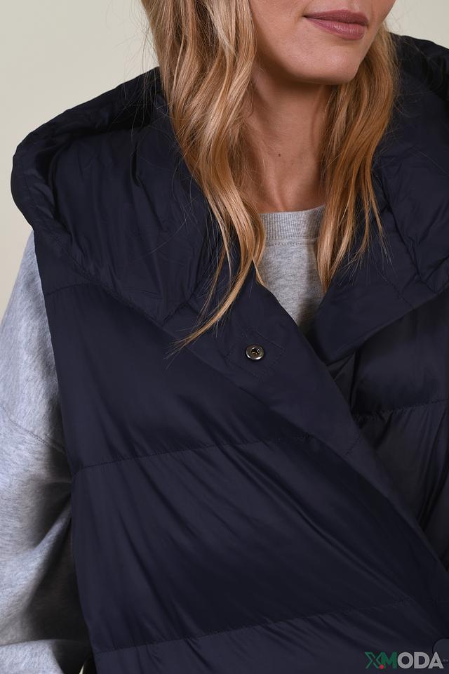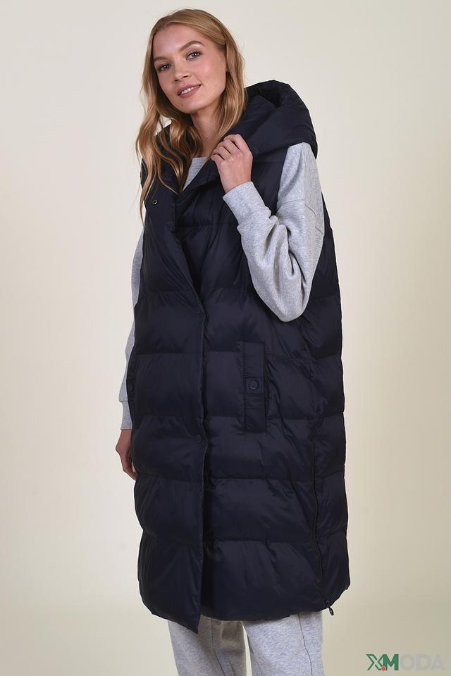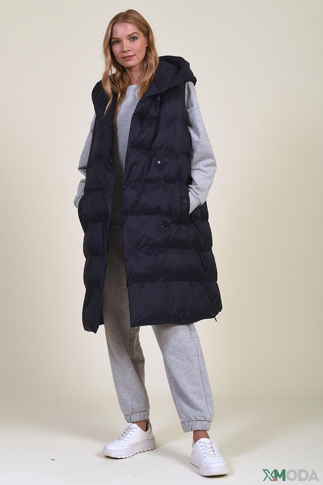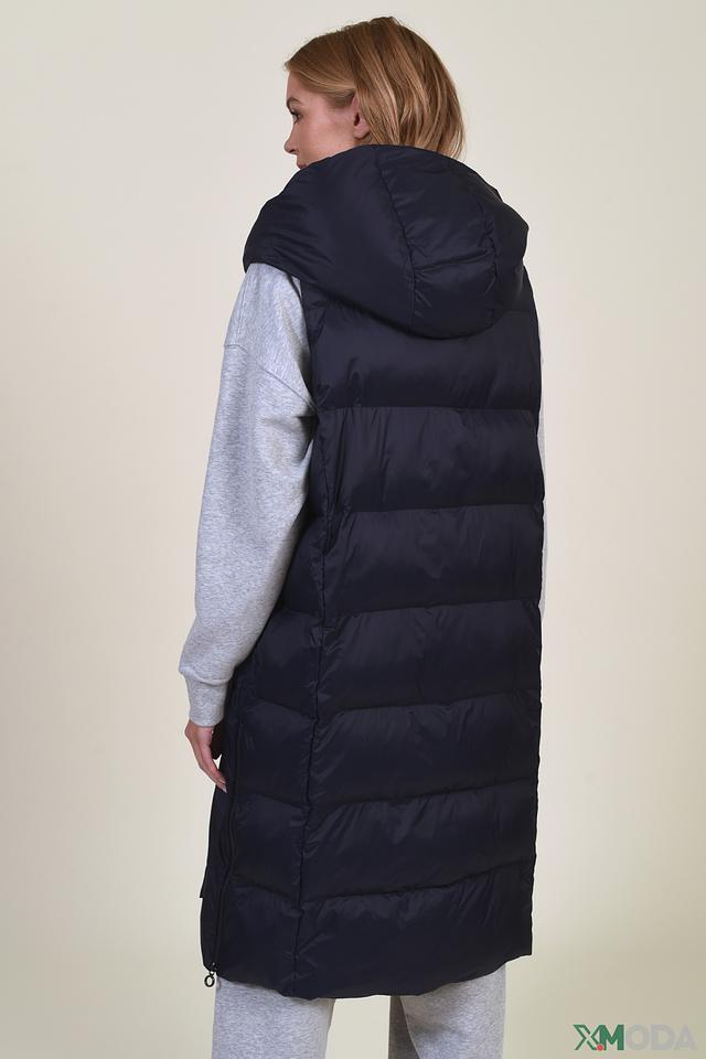 Жилет имеет удлиненный крой, который обеспечивает дополнительное тепло и защиту от ветра. Стеганая фактура придает модели современный и элегантный вид. Капюшон добавляет функциональности и практичности, защищая от непогоды.