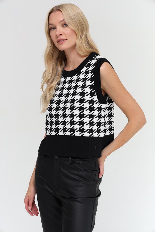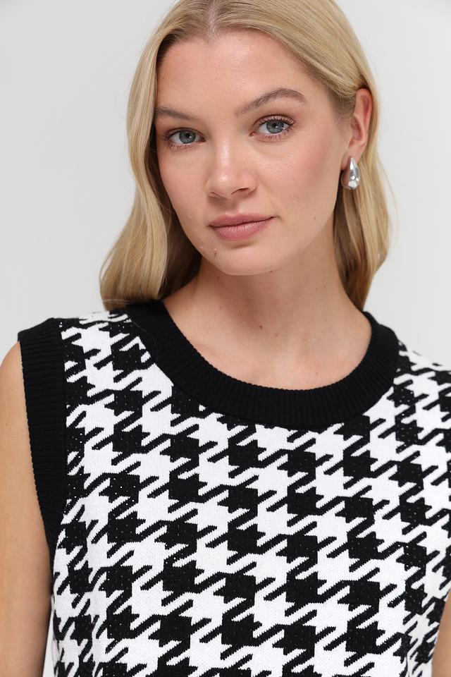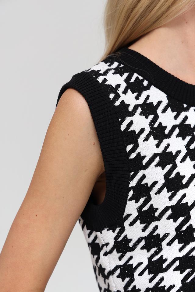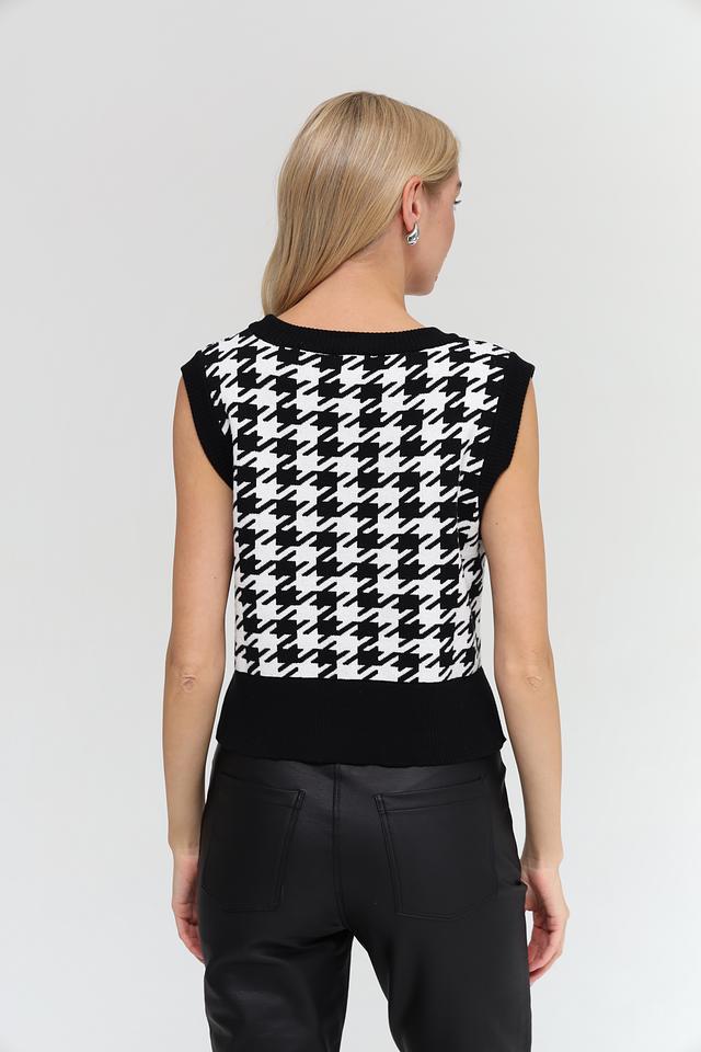 Жилет имеет классический чёрно-белый цвет и украшен узором "гусиная лапка", который придает ему элегантный и изысканный вид. Круглый вырез горловины и приталенный силуэт подчеркивают фигуру и делают образ более женственным.