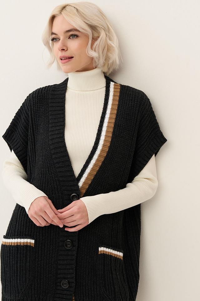 Жилет имеет свободный крой, V-образный вырез и застегивается на пуговицы по всей длине. На передней части расположены два удобных кармана, также оформленные полосками. Модель выполнена из смесового материала, содержащего 30% шерсти и 70% полиакрила, что обеспечивает мягкость, тепло и простоту в уходе.