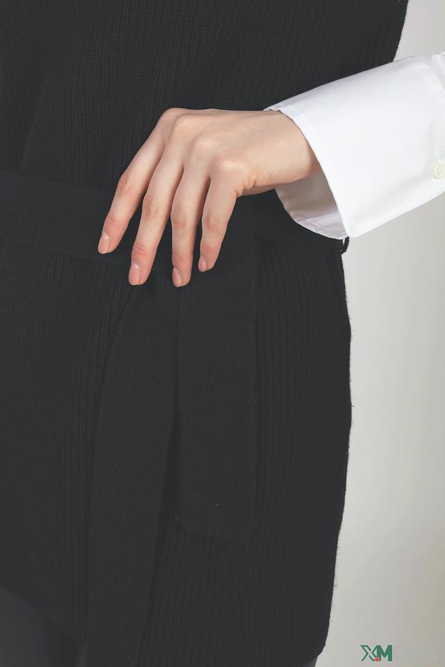 Жилет имеет прямой крой и длину до середины бедра. За счет добавления шерсти изделие хорошо держит форму и не мнется. Пояс позволяет подчеркнуть силуэт и создать более женственный образ.