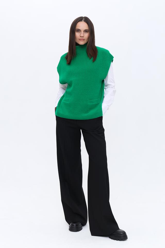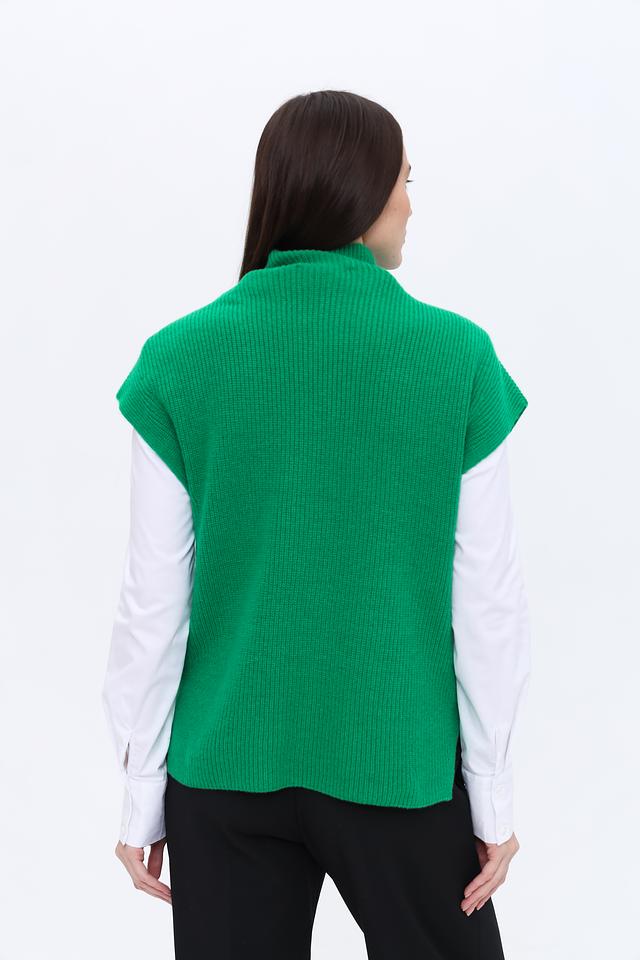 Женский жилет Oui насыщенного зелёного цвета выполнен из мягкого вязаного полотна. Модель с высоким воротом и удобными карманами станет стильным дополнением к вашему гардеробу. Состав: шерсть 50%, полиамид 30%, модал 20%